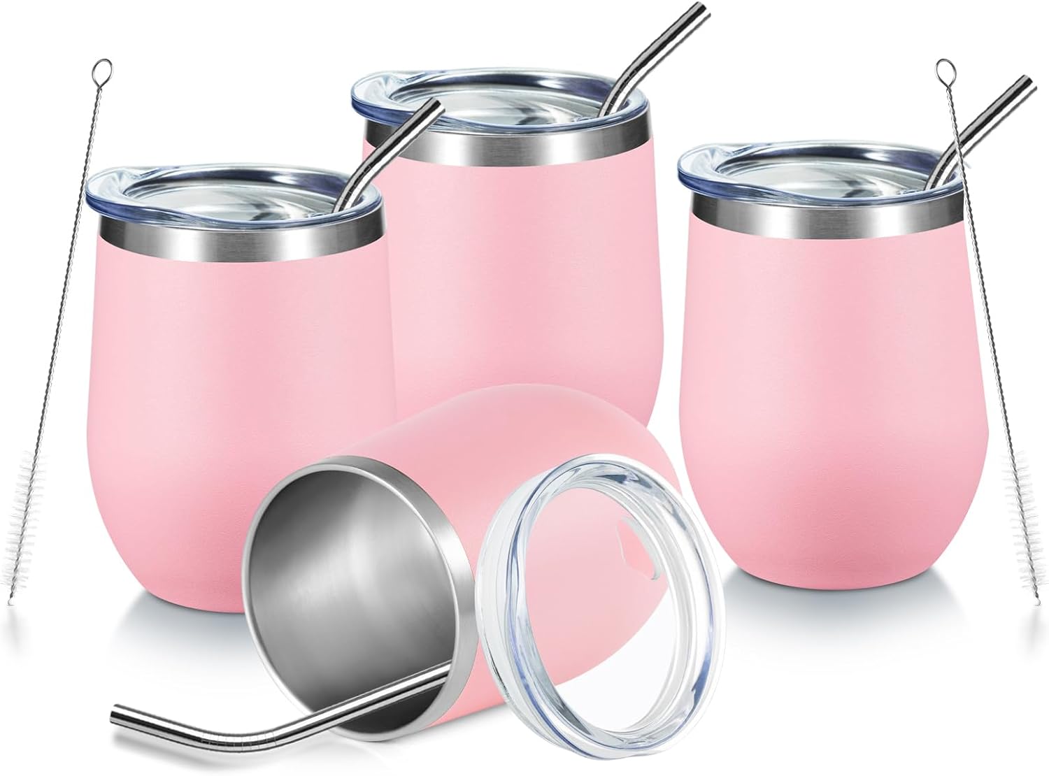 COMOOO Stainless Steel Wine Tumbler 4 Pack with Lid and Straw 12oz Double Wall Vacuum Insulated Travel Tumbler Cup Stemless for Hot and Cold Drinks,Coffee,Wine,Cocktails, Pink