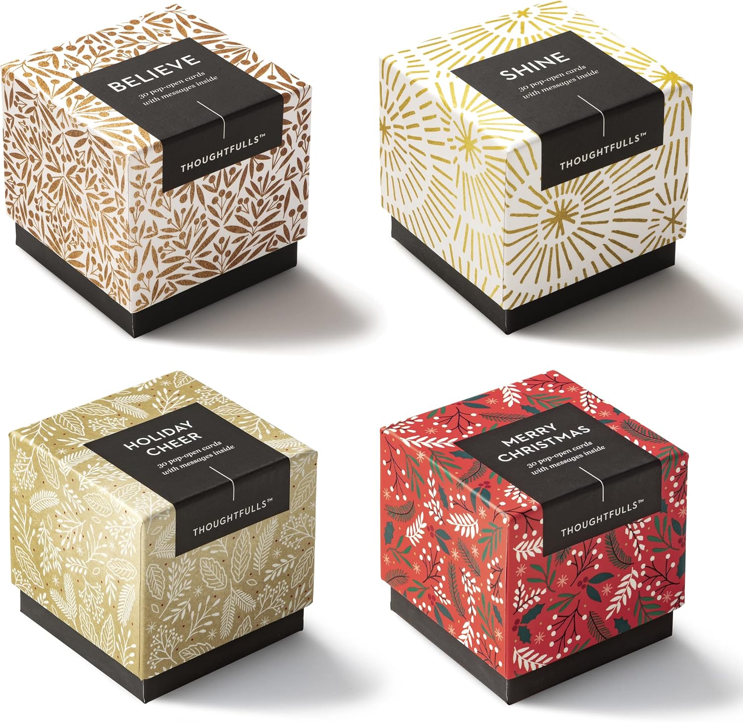THEME – CHRISTMAS CHEER: Included in this pack are 4 boxes of ThoughtFulls - 1 box of Believe, 1 box of Shine, 1 box of Holiday Cheer, and 1 box of Merry Christmas. Every box features 30 cards, each with a unique quote to welcome the season's wonder. Tuck these ThoughtFulls into holiday cards, use them as gift tags, or open them yourself to reconnect with joy.