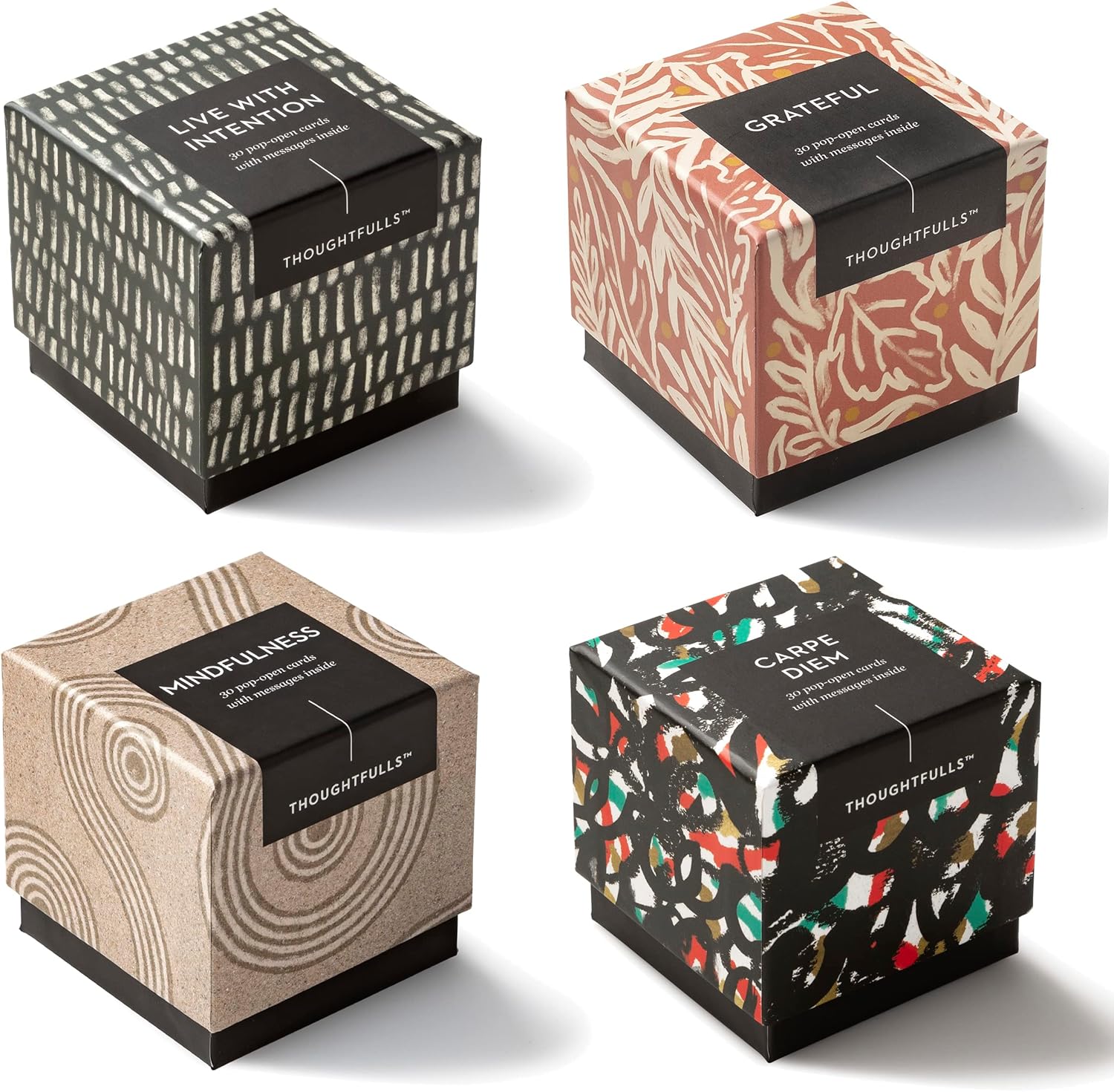 THEME – LIVE WITH PURPOSE: Included in this pack are 4 boxes of ThoughtFulls - 1 box of Grateful, 1 box of Live with Intention, 1 box of Mindfulness, and 1 box of Carpe Diem. Every box features 30 cards, each with a unique quote to ground you. Share with a friend, family member, coworker, or anyone to encourage presence.