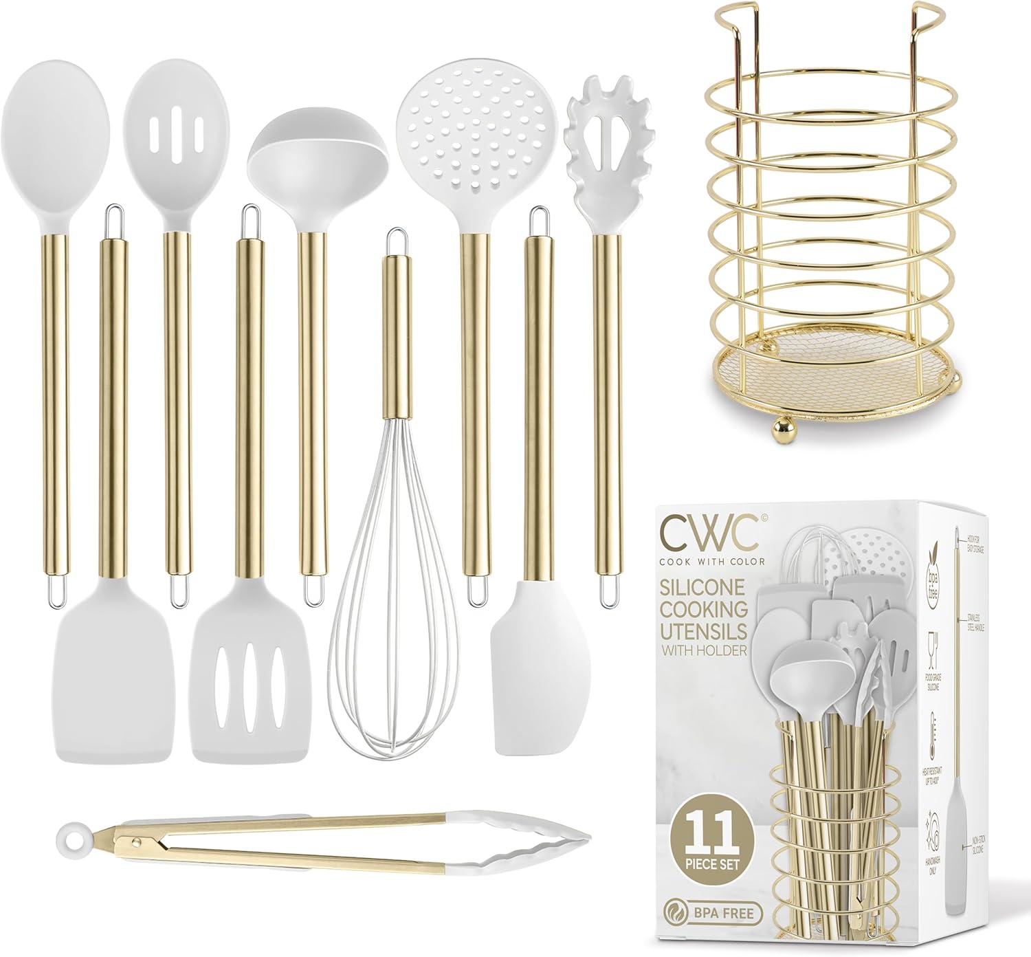 Gold utensil set with metallic tones, this set of silicone kitchen tools has an up to date, trendy look that is madly in line with the current styles and trends. Add a splash of color and funk to your kitchen and hang from the rings on each utensil.