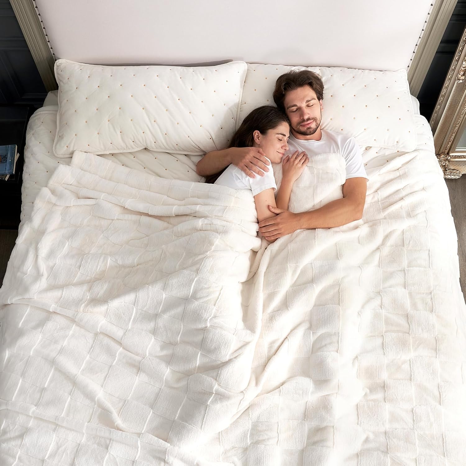 Cozy Bliss Checkered White Large Faux Rabbit Fur Queen Size Blanket, Soft Fuzzy Fluffy Minky Cream Furry Blankets for Couch, Bed (90 * 90 Inches Ivory)