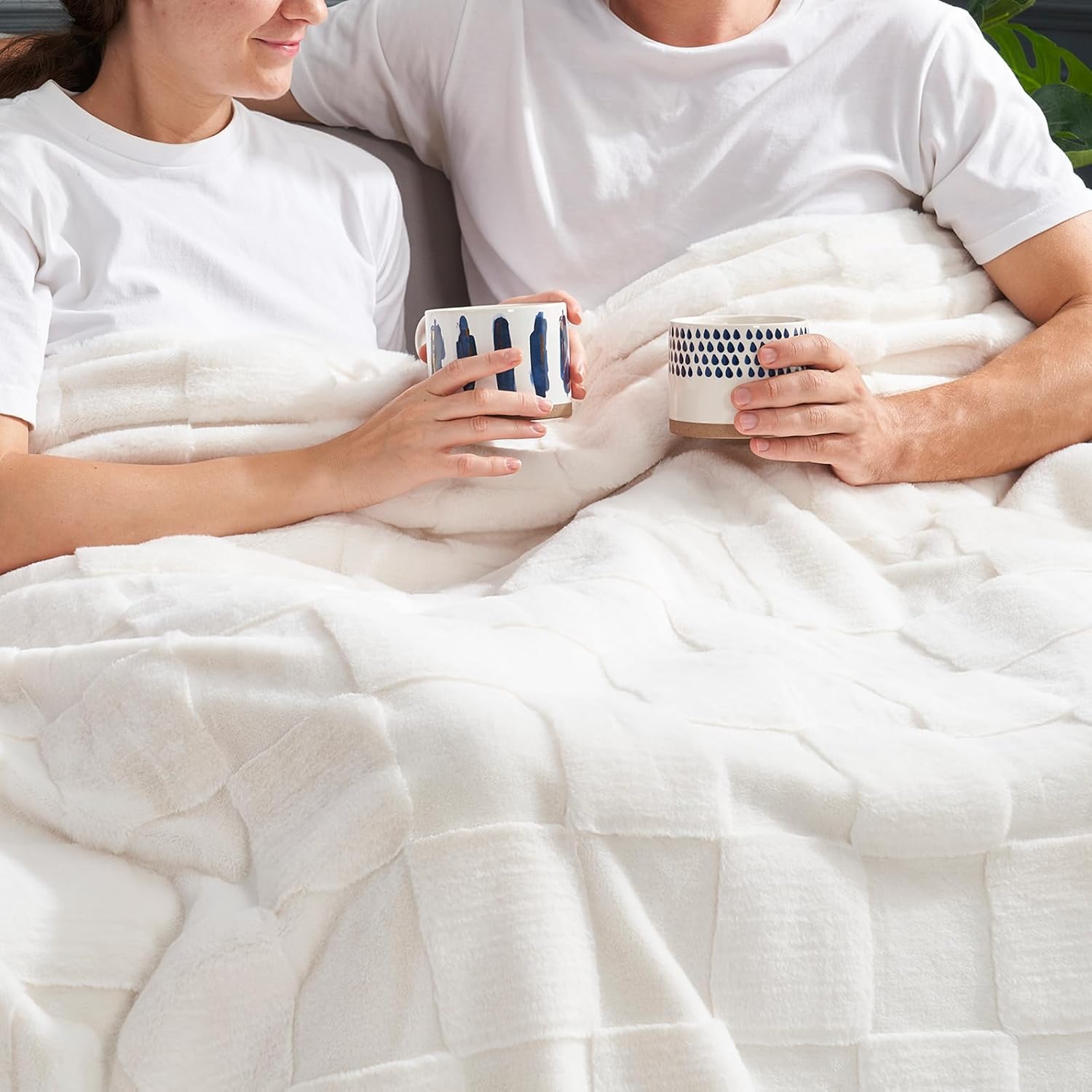 Cozy Bliss Checkered White Large Faux Rabbit Fur Twin Bed Blanket, Soft Fuzzy Fluffy Minky Cream Furry Blankets for Couch, Bed, Adults (60 * 80 Inches Ivory)