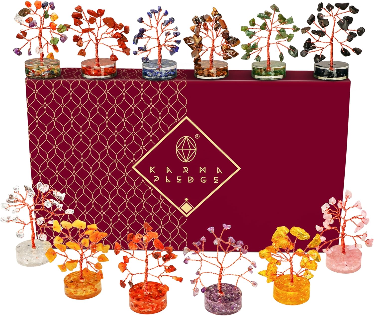 Crystal Tree Desk Decoration, Tree of Life 7 Chakra Healing Crystals & Stones for Positive Energy, Good Luck Gifts for Women and Mens, Set of 12 Handcrafted Trees for Home & Office (Orgone Base)