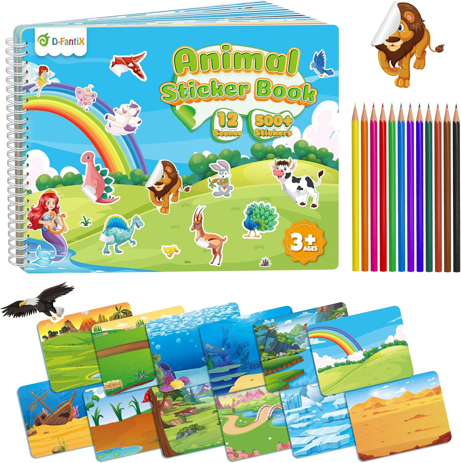 D-FantiX Animal Sticker Book for Kids, Dinosaur Unicorn Mermaid Farm 12 Scenes and 500+ Stickers, Toddler Airplane Travel Road Trip Essentials Activity Book, Arts & Crafts Gift for Ages 3-8