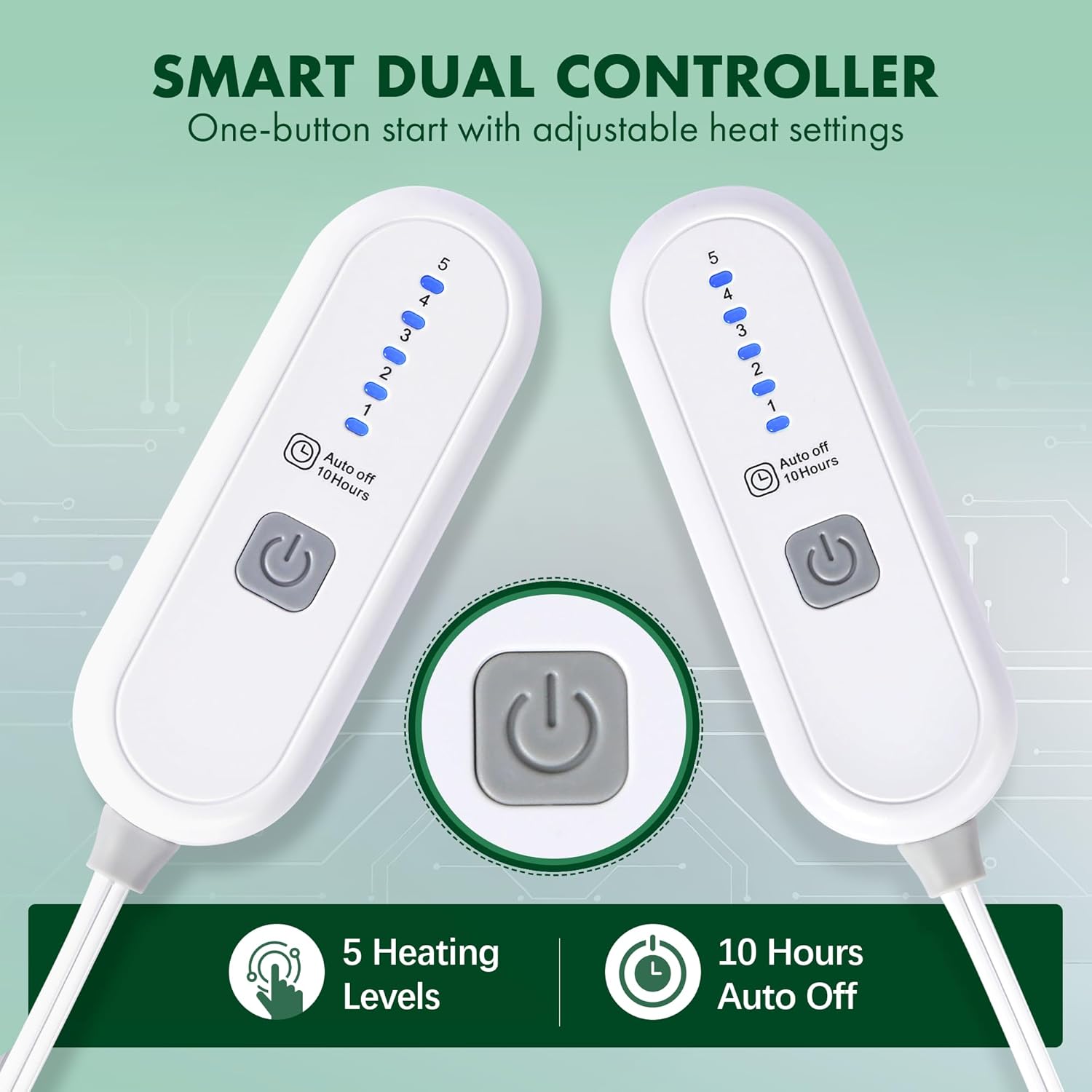 Dual-Zone Independent Temperature Control - Crafted with ultra-soft 100% polyester, this luxurious king size heated blanket features dual controllers with 5 heat settings and 10 hours auto off, warming up quickly and fitting king-sized mattresses perfectly