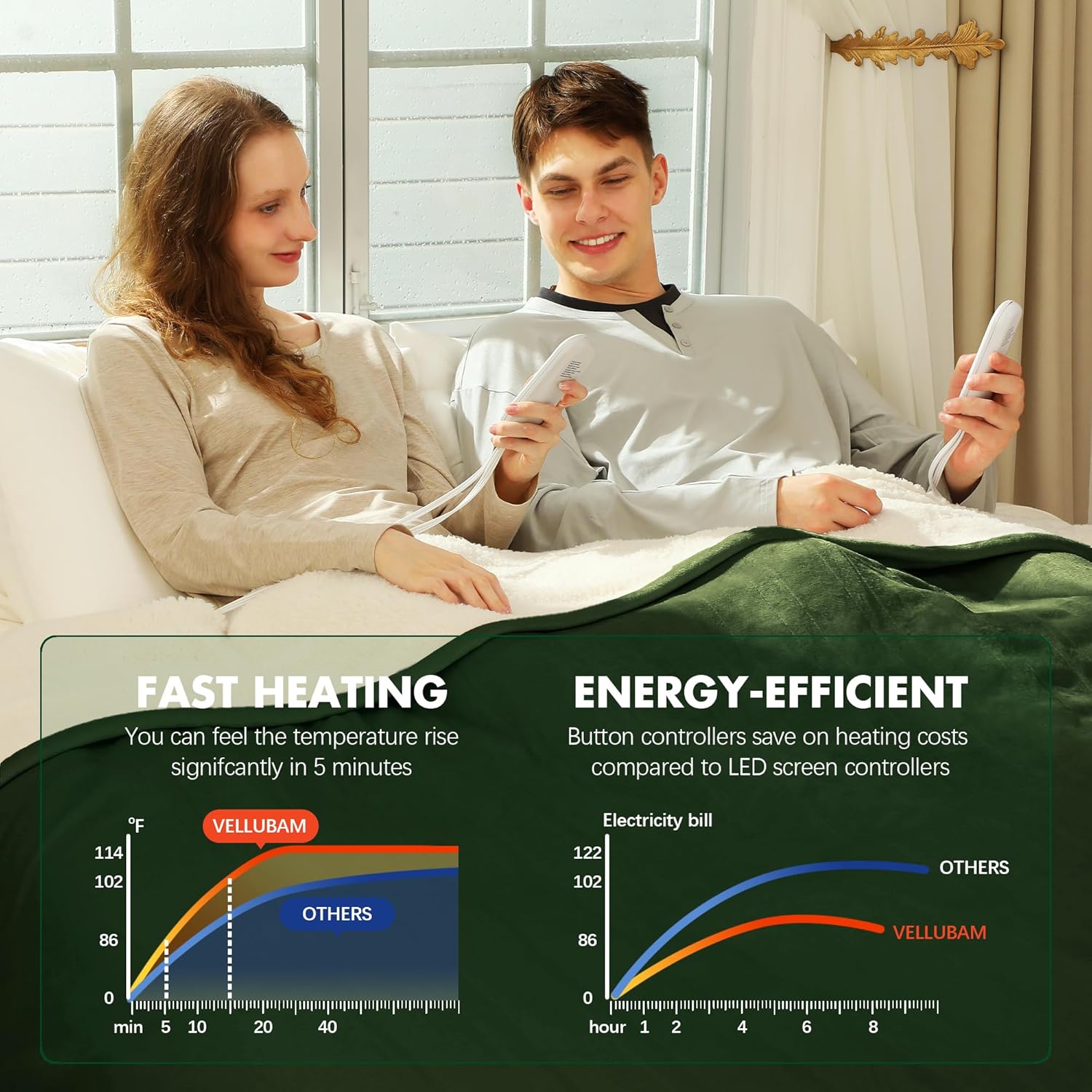ETL & FCC Certified - The VELLUBAM electric blanket is rigorously tested and certified by ETL and FCC, ensuring enhanced safety and minimal electromagnetic radiation during use. Featuring advanced overheat protection, the heating blanket automatically stops heating or cuts power if temperatures rise too high, eliminating potential hazards