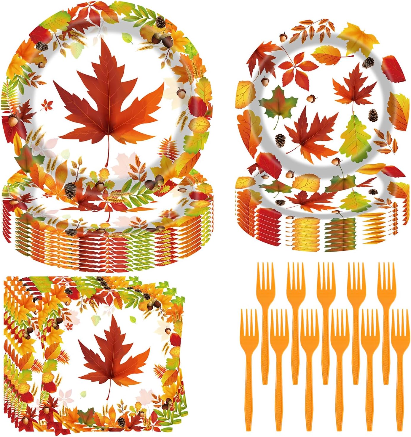Fall Party Supplies - 96 Pcs Autumn Maple Leaf Disposable Tableware Set with Paper Plates, Napkins, Forks for Thanksgiving Harvest Party Decorations