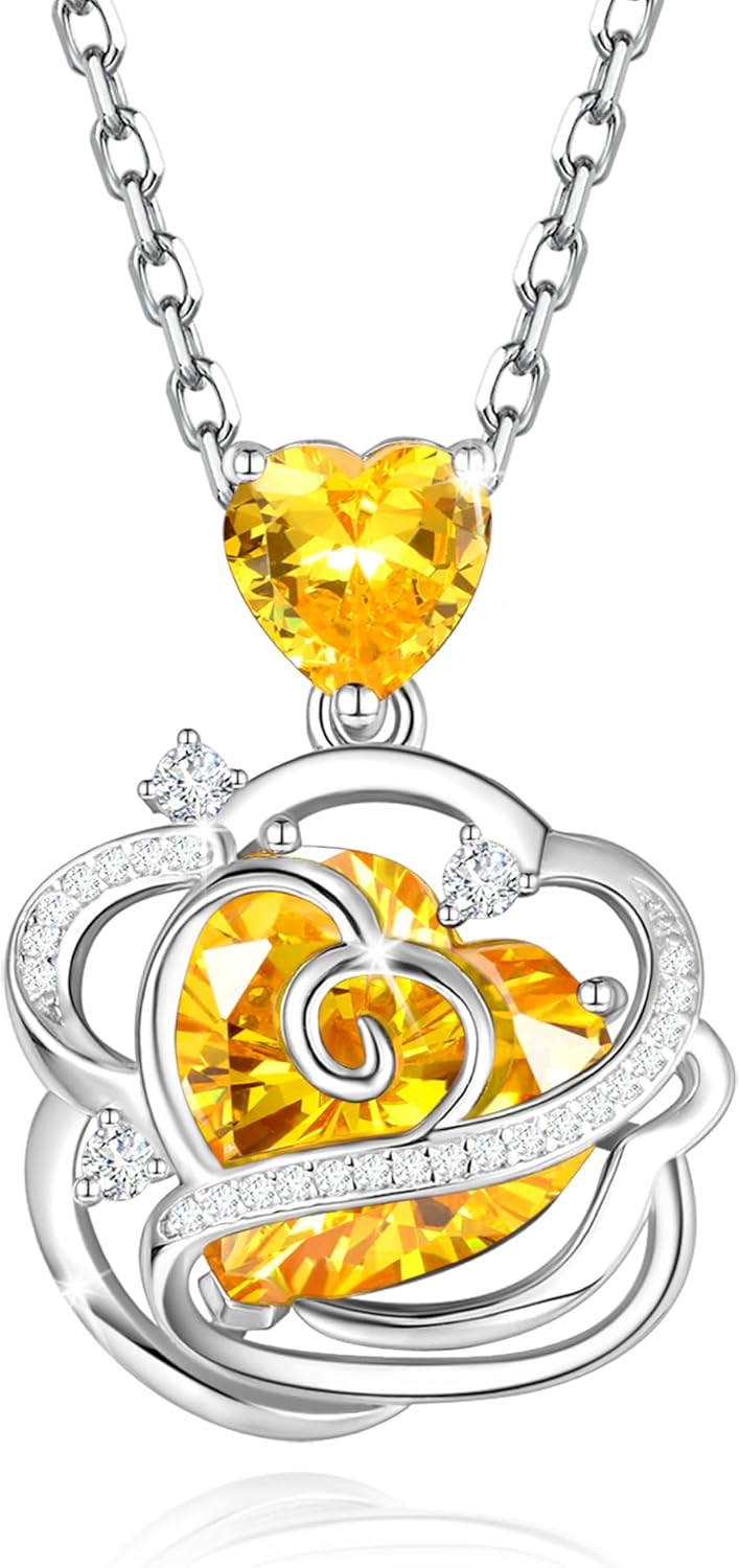 November Birthstone Jewelry -- This Thornless Pulse necklace is inlaid with stunning and shining gem-quality 5A cubic zirconia, with a created citrine in the center of the pendant. Citrine is the November birthstone, represents friendship and happiness. It also the stone given to celebrate the 13th wedding anniversary.