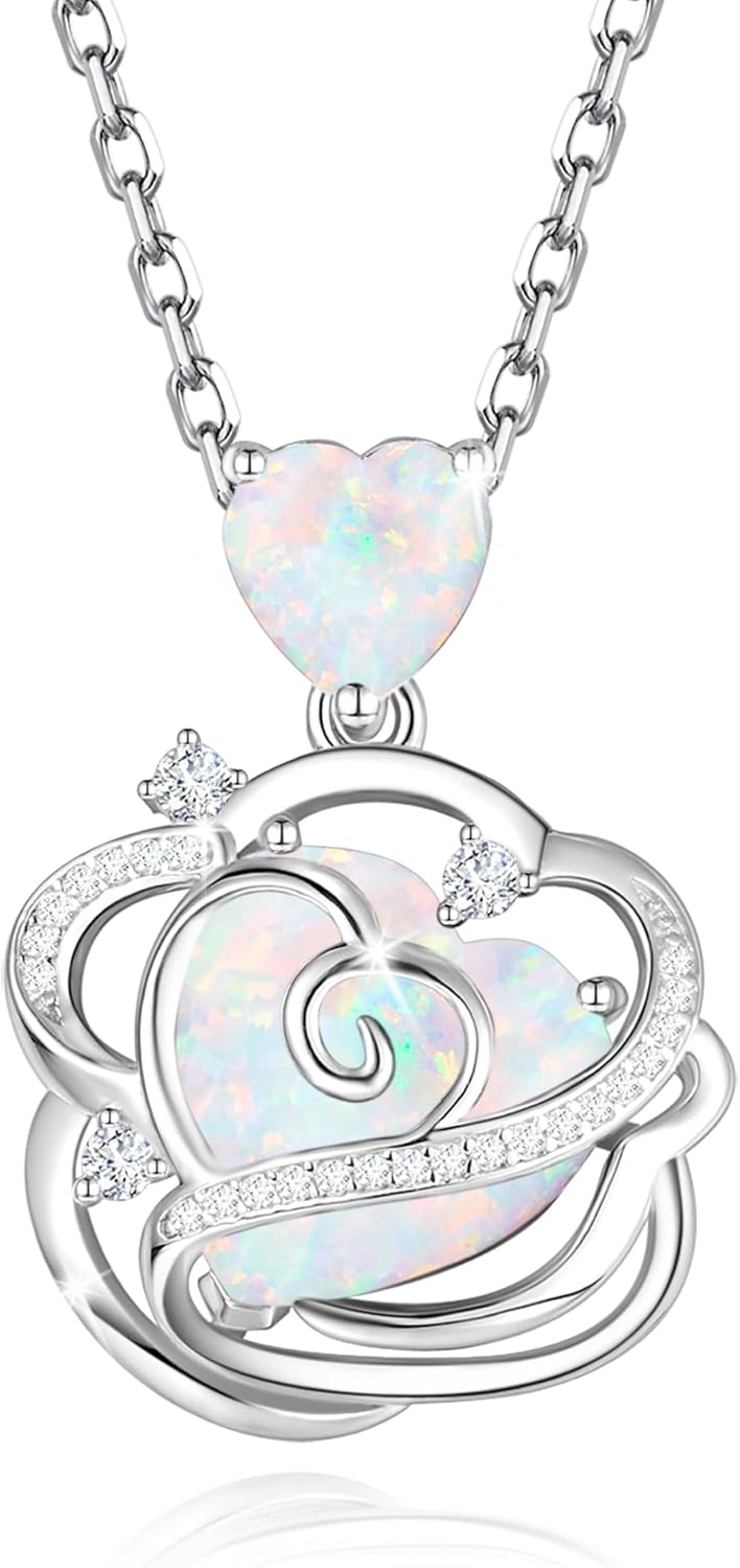 October Birthstone Jewelry -- This Thornless Pulse necklace is inlaid with stunning and shining gem-quality 5A cubic zirconia, with a created opal in the center of the pendant. Opal is the October Birthstone, be a symbol of purity, hope and truth. It also the stone given to celebrate the 14th wedding anniversary.