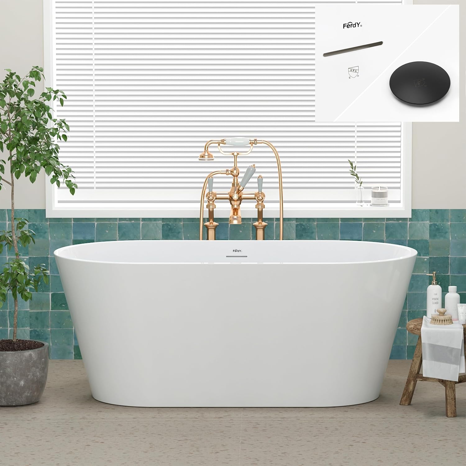 FerdY 59" Shangri-La Elite, Acrylic Freestanding Bathtub, Modern & Contemporary Design Soaking Tub with Matte Black Pop-Up Drain and Minimalist Design Overflow, Glossy White, cUPC Certified