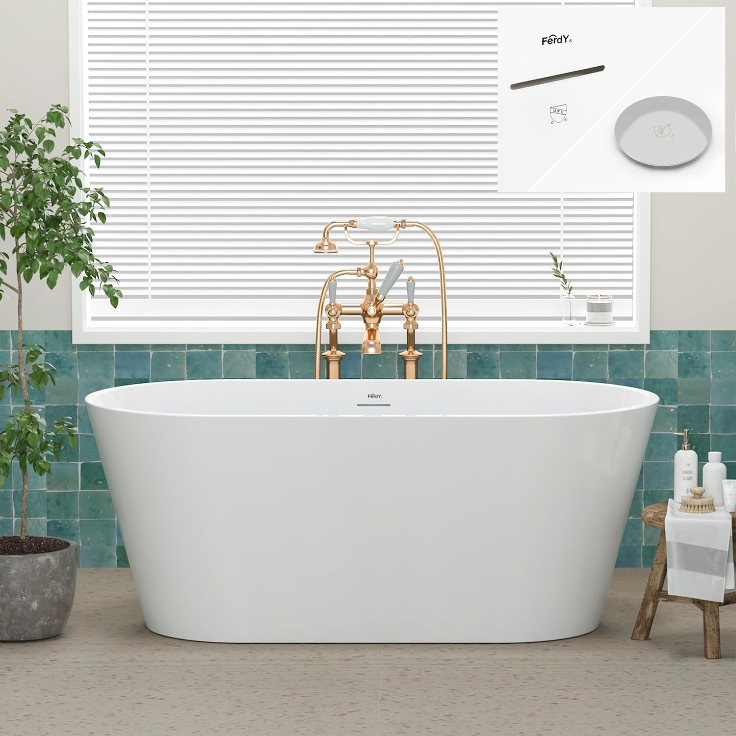 FerdY 59" Shangri-La Elite, Acrylic Freestanding Bathtub, Modern & Contemporary Design Soaking Tub with Polished Chrome Pop-Up Drain and Minimalist Design Overflow, Glossy White, cUPC Certified