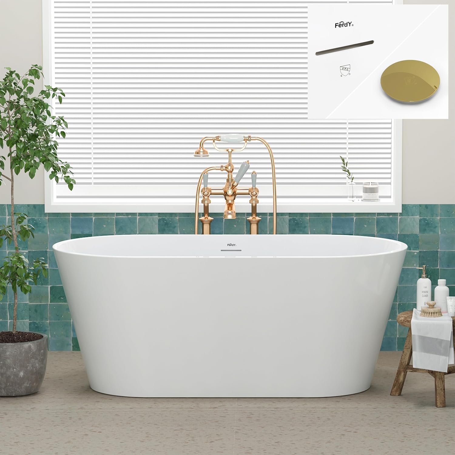 FerdY 59" Shangri-La Elite, Acrylic Freestanding Bathtub, Modern & Contemporary Design Soaking Tub with Polished Gold Pop-Up Drain and Minimalist Design Overflow, Glossy White, cUPC Certified