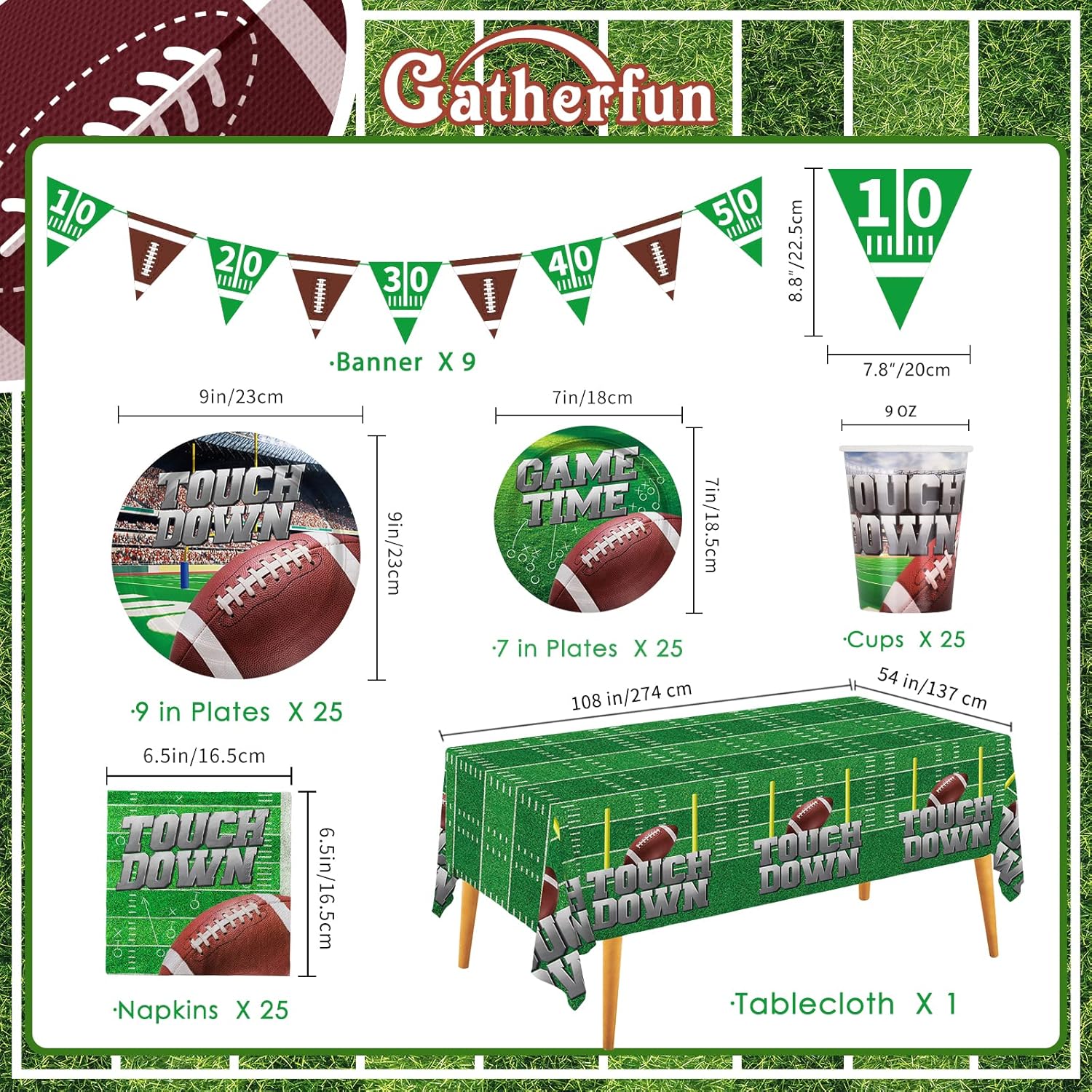 SERVE 25: Football theme birthday party supplies pack contains, 25 x 9 inch paper dinner plate, 25 x 7 inch paper dessert plates, 25 x 9 oz cups, 25 x paper napkins (3ply, 6.5” x 6.5”folded), 1 pc 54 x 108 inch disposable plastic touchdown tablecloth, 1 set paperbanner (It combines by yard number of the field and the football pattern).
