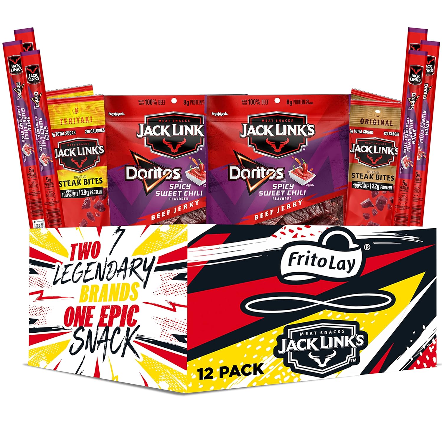 Sampler pack includes 12 individually wrapped snacks: 2 Jack Link’s Doritos Spicy Sweet Chili Flavored Beef Jerky (2.65oz Bag), 6 Jack Link’s Doritos Spicy Sweet Chili Flavored Meat Stick (0.92oz), 2 Jack Link's Original Beef Steak Bites (1.75oz), 2 Jack Link’s Teriyaki Beef Steak Bites (1.75oz).