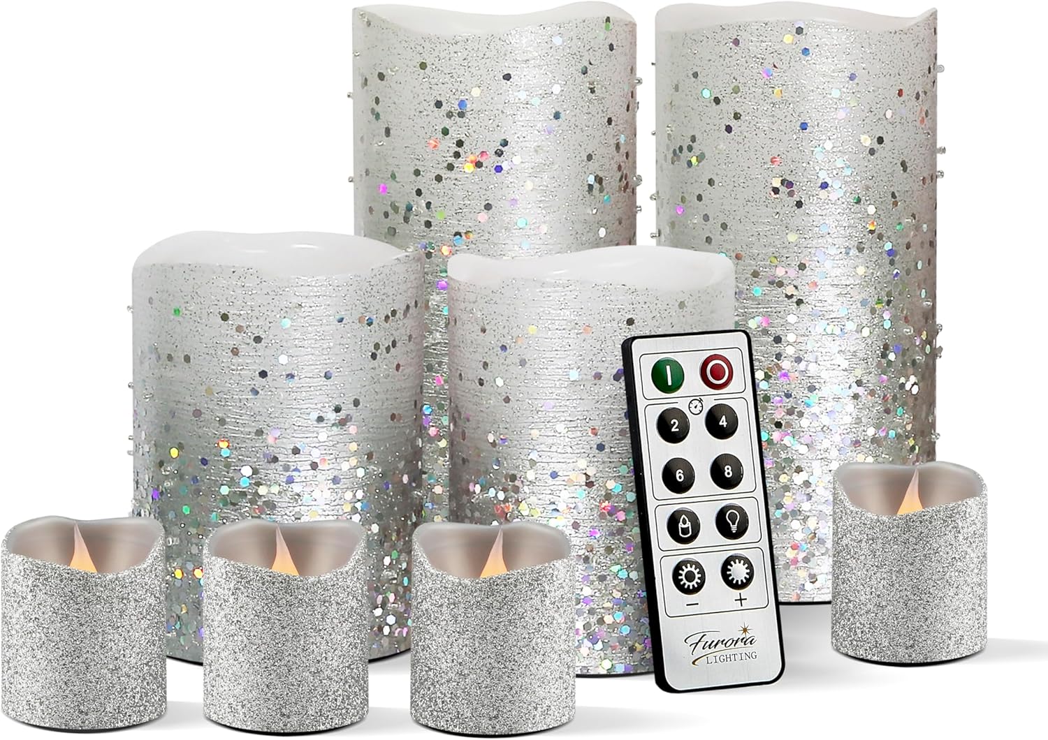 FURORA LIGHTING Silver Glitter LED Candles with Remote and Timer, 4 Pillars and 4 Votives Pack of 8, Real Wax Flameless Flickering Candles for Home Décor, Battery Included