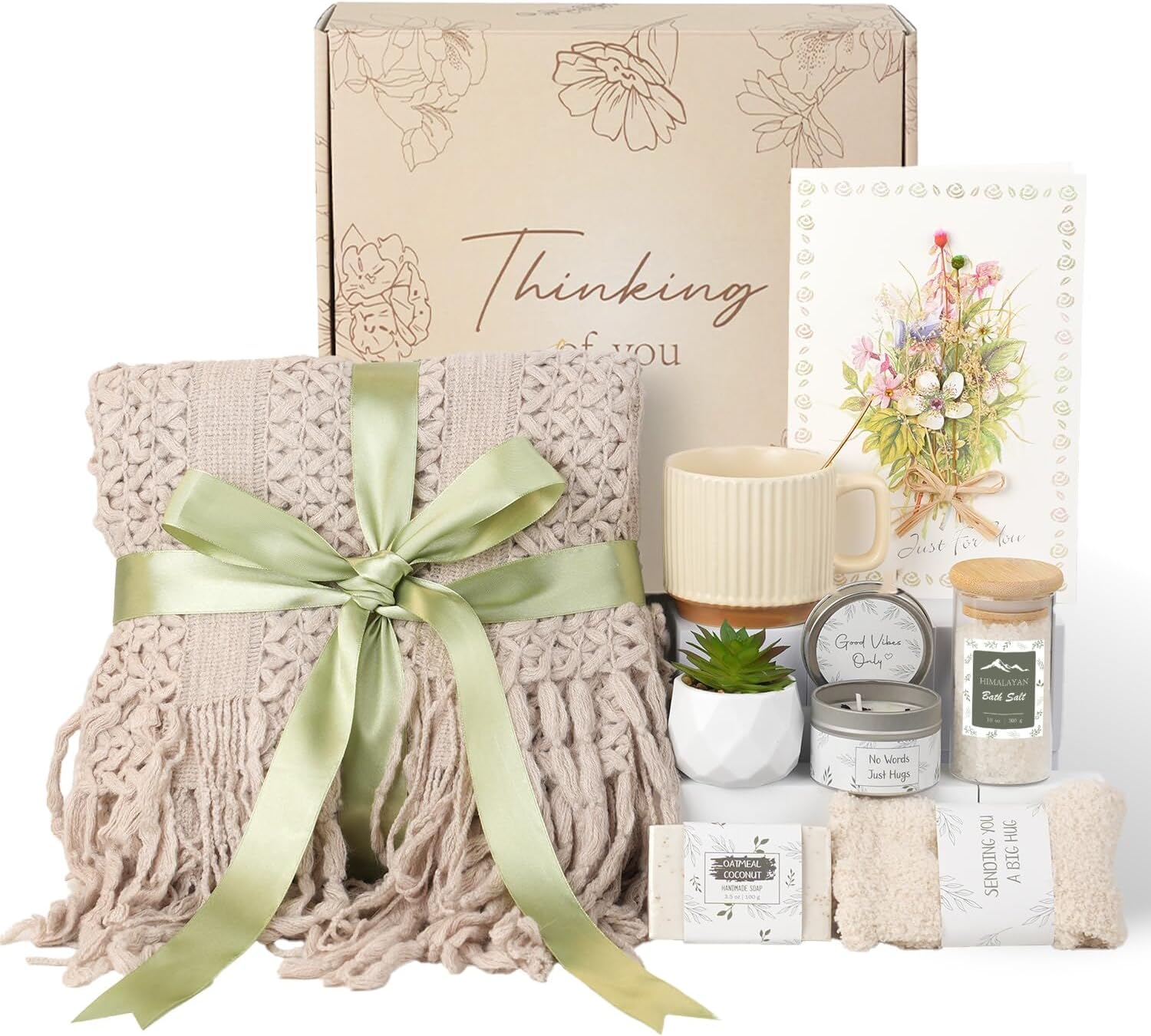 A Hug in a Box: Our spa gift baskets for women deliver a thoughtful blend of comfort and care. The soft knitted tassel blanket provides a warm embrace, while the elegant gift box and heartfelt gift card convey your sincere wishes. It's the perfect way to say "I'm thinking of you" with a gift that feels like a hug in a box.