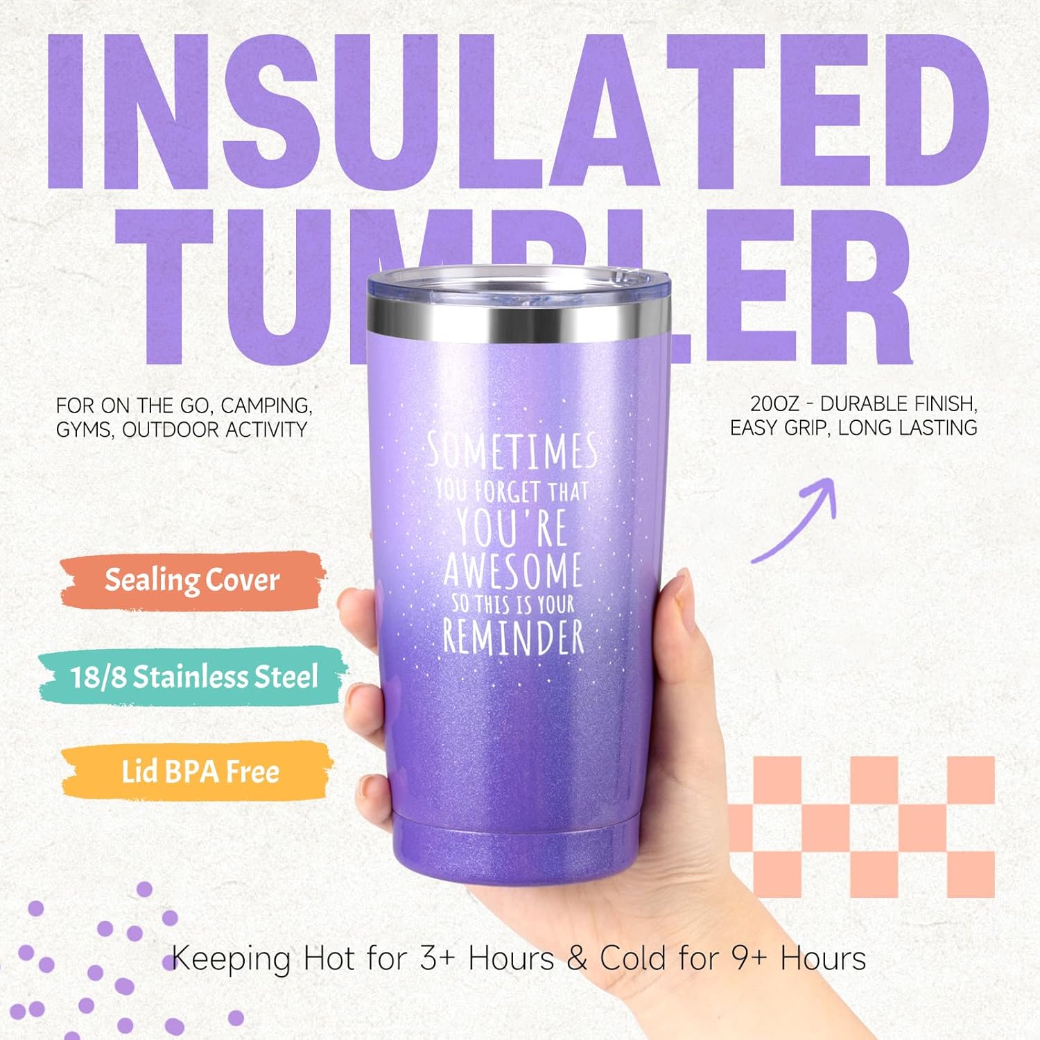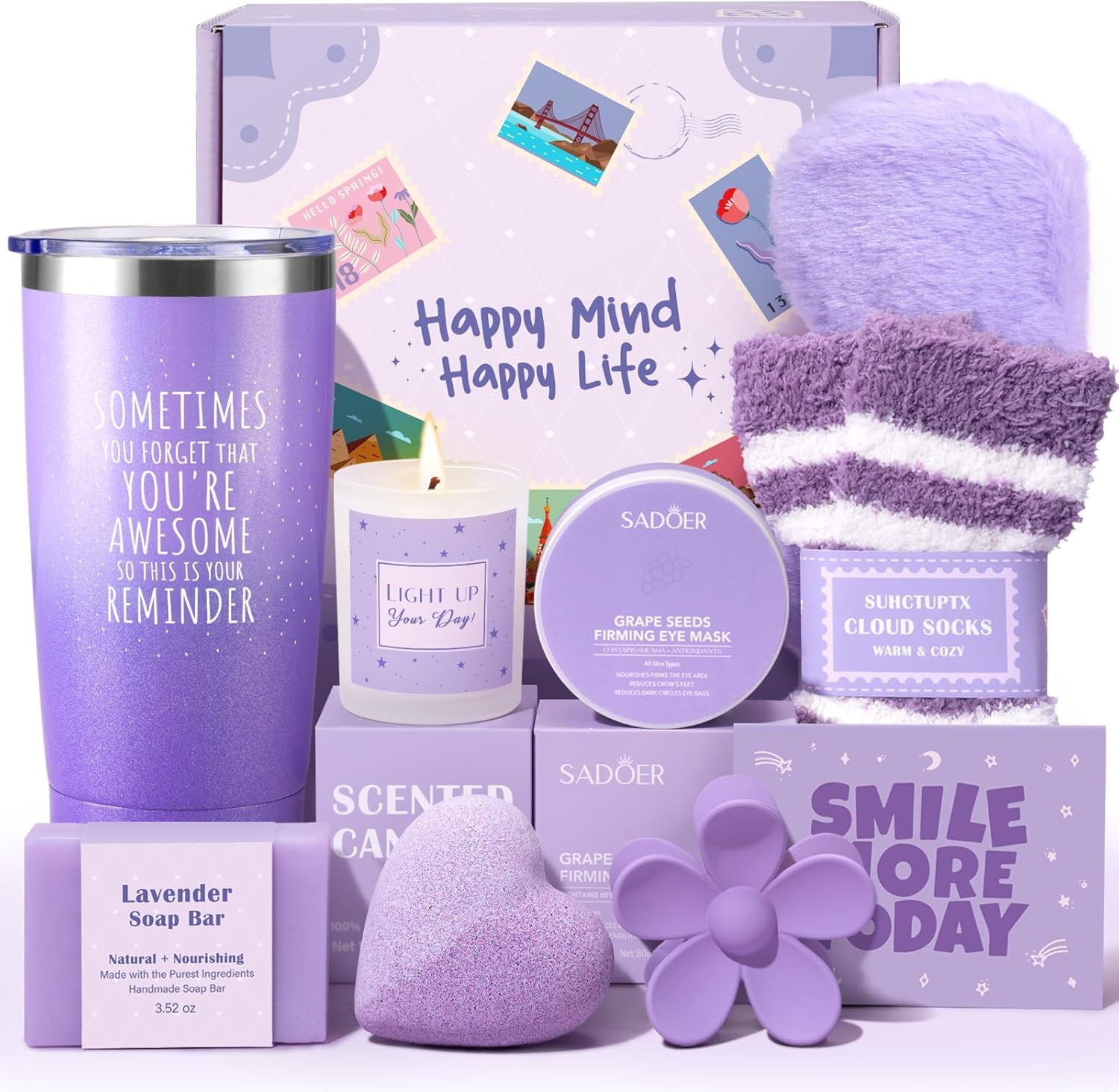 【THIS WILL BE A HIT】Suhctuptx makes gifting twice as fun! Inspired by warm lavender tones and a playful retro vibe, it’s designed to spread gratitude, joy, and positive energy—From the sparkling inspirational travel tumbler to relaxing spa gifts, every item is carefully selected to brighten her day. Whether you're saying “Happy Birthday,” “Thank You I Love You Mom,” “Long live friendship” or “Merry Christmas,” this vibrant and feel-better gift set is sure to stand out and make her smile.
