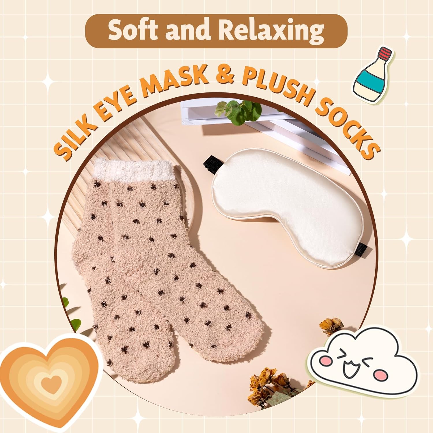 【9 PCS UNIQUE GIFTS FOR WOMEN】Our gift baskets for women is filled with stylish, colorful items that are unique and high quality, including: (1) Small Ceramic Coffee Mug(May randomly include a tea spoon or a fork) | (2) Silk Eye Mask | (3) Plush Fuzzy Socks | (4) Scented Candle | (5) Leather Journal Travelers Notebook | (6) Black Pens | (7) Hand Cream | (8) Oatmeal Coconut Soap Bar | (9) Greeting Gifts Card | (10) Cute Gift Box. (See pictures for details)
