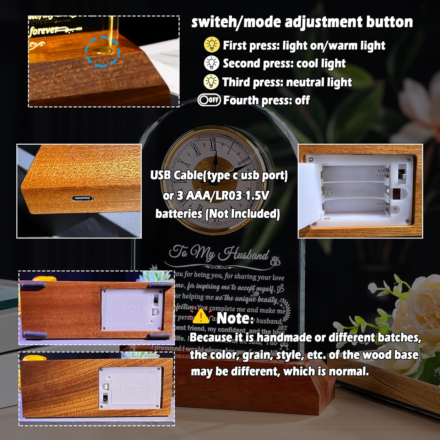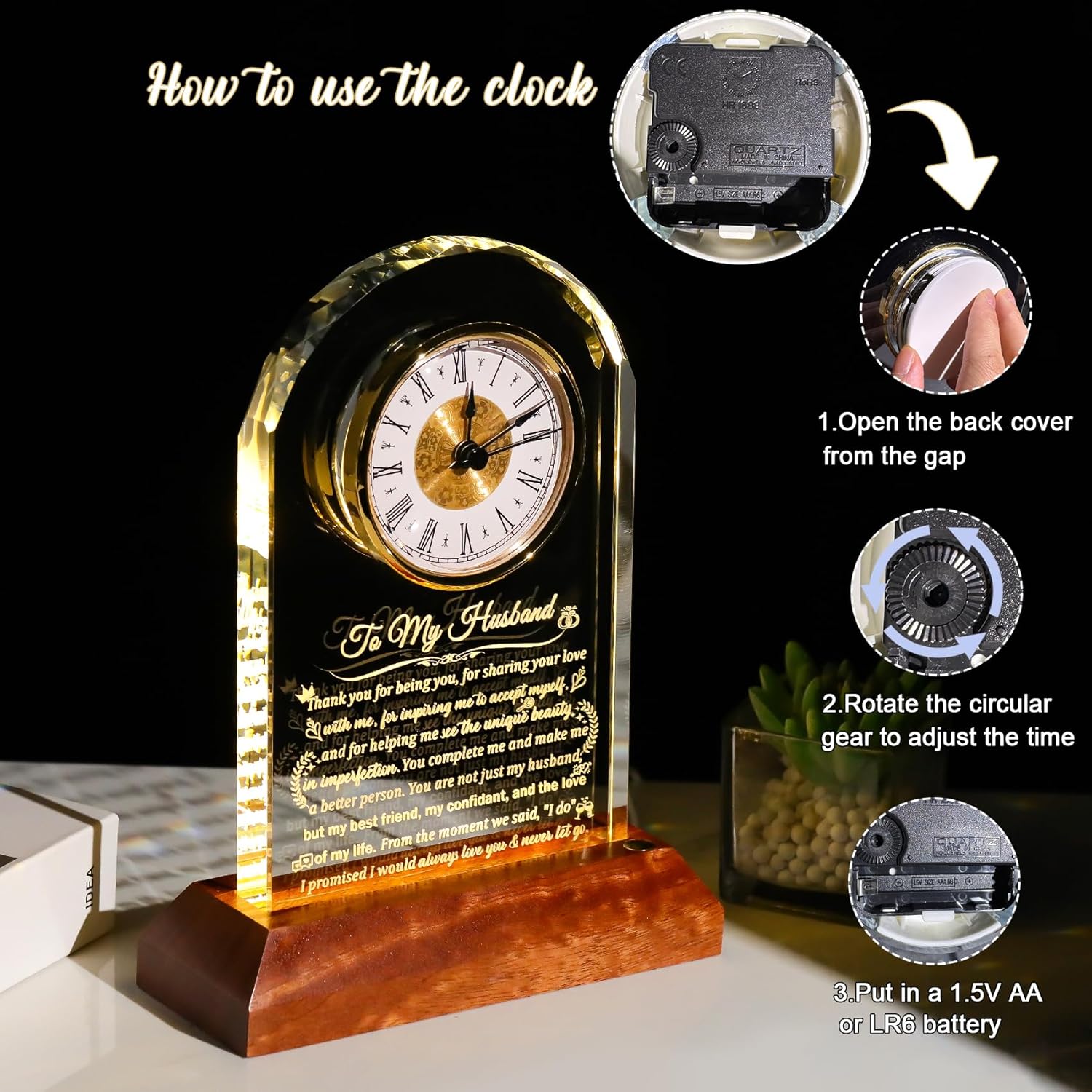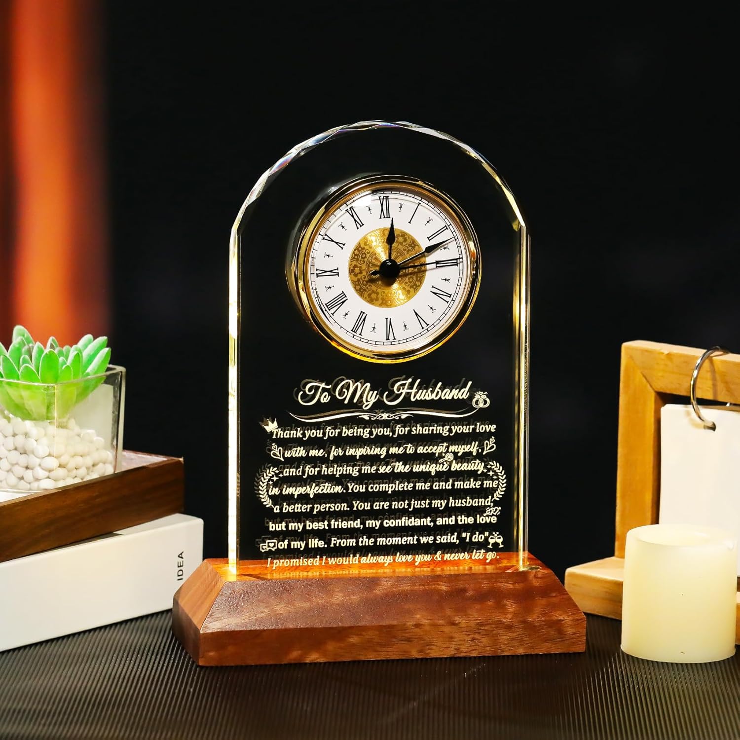 Elegant Design - If you look for a unique gift for your husband, our glass clock is a special choice. This quartz clock is elegantly designed and comes with premium wooden base. Soft lighting adds warmth to any space and is an ideal gift that combines functionality and fashion. Loving words can warm and move his heart. It will not fade or wither like flowers, symbolizing your undying love for your husband