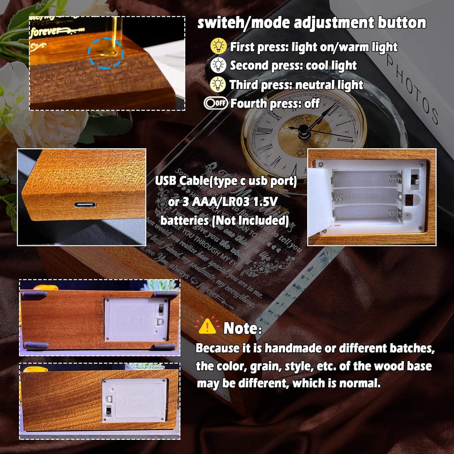 Elegant Design - If you look for a unique gift for your wife, our glass clock is a special choice. This quartz clock is elegantly designed and comes with premium wooden base. Soft lighting adds warmth to any space and is an ideal gift that combines functionality and fashion. Loving words can warm and move her heart. It will not fade or wither like flowers, symbolizing your undying love for your wife