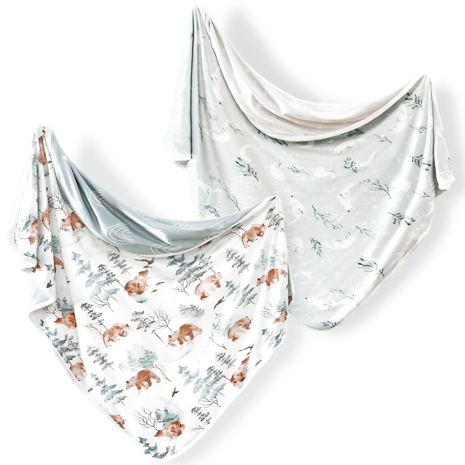GRSSDER Baby Blankets 2 Pack Super Soft Jersey Knit Swaddle Blankets for Baby Girls and Boys, Double Layer Receiving Blankets 34 x 44 Extra Large for Swaddling, Bear & Snow Wolf