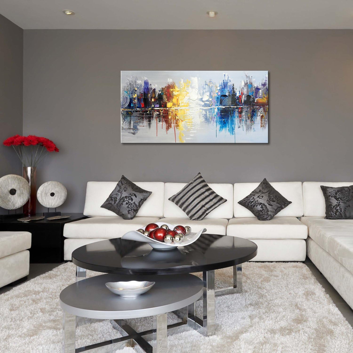 Hand Painted cityscape oil painting on canvas by our professional artists. This is handmade abstract city canvas wall art. This textured contemporary cityscape reflection artwork is suitable for living room, bedroom, kitchen, office, Hotel, dining room, bathroom, bar etc.
