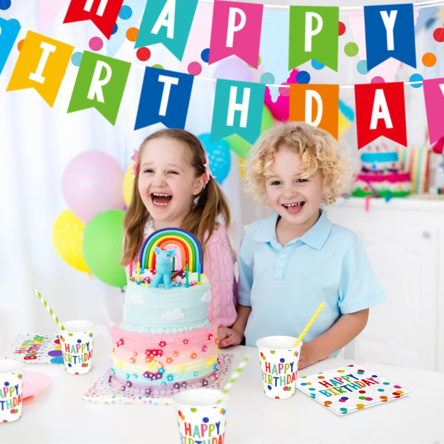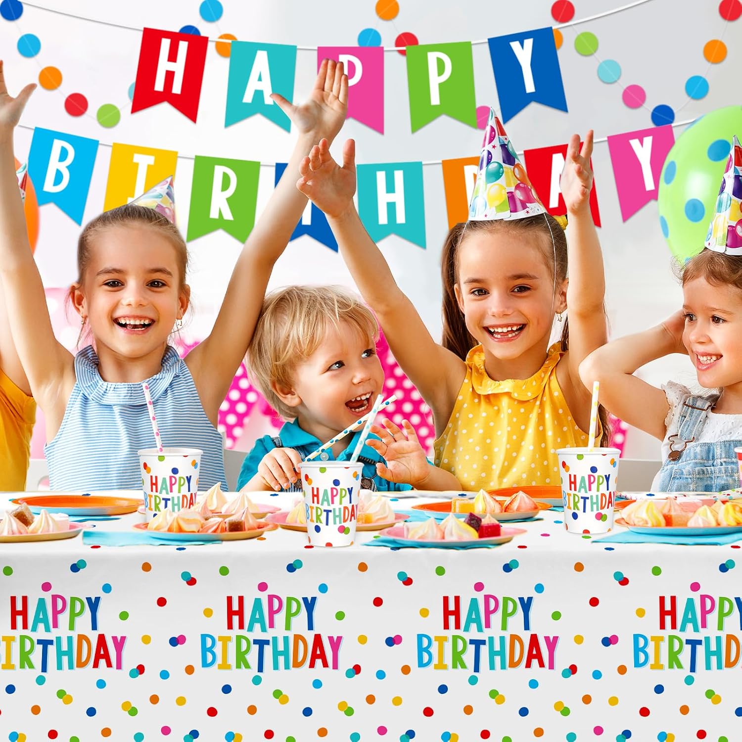 Comprehensive Birthday Set: Our package includes 25pcs of 9" happy birthday plates, 25pcs of 7" paper plates, 25pcs of 6.5" * 6.5" paper napkins, 25pcs of 9oz paper cups, 1pc banner, 1pc 54" * 108" tablecloth, and 1pc colorful circle paper garland. Making it perfect for birthday party supplies.