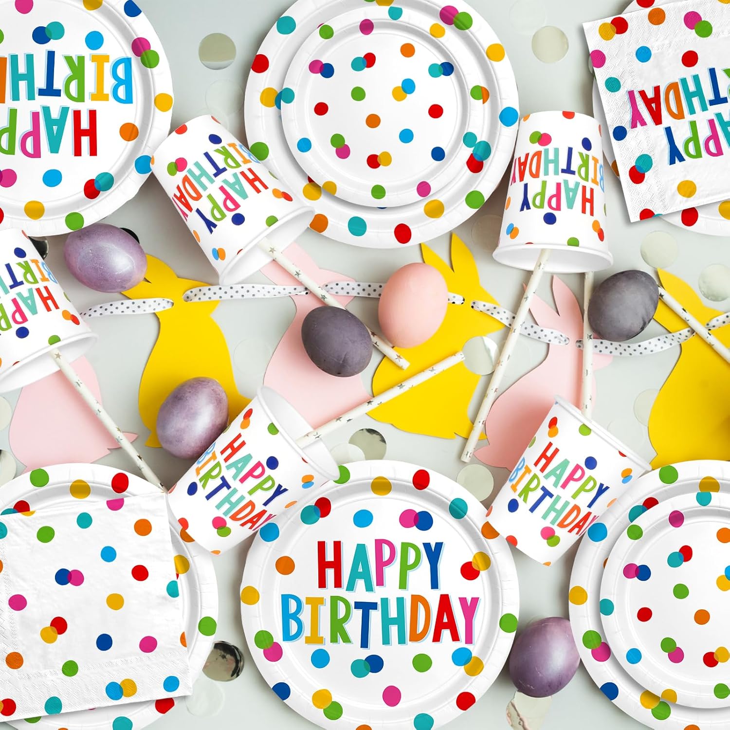 Happy Birthday Decorations: Happy Birthday Party Supplies Set with Birthday Dots Design- Includes Disposable Paper Birthday Plates and Napkins, Cups, Tablecloth, and Banner for Boys/Girls, Serves 25.