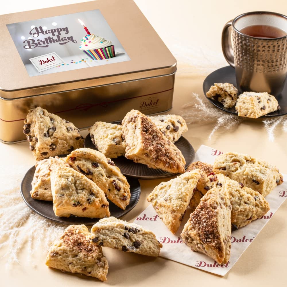 ENJOY THE SUPERB TASTE OF GOURMET BAKED DELICACIES: Our decadent Artisan Scones are packaged individually and come in a beautiful, deluxe tin box that keeps them fresh for longer. Its charming, rustic design completes this wonderful gift by adding a delightful Happy Birthday Message. The tin box is reusable, so you can use it to store your own yummy goodies!