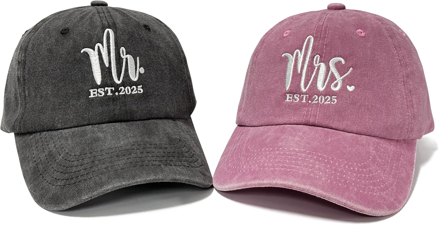 Set of 2: This is a set of Matching Couple caps. One washed black baseball cap embroidered with White stitching "Mr. EST.2025" and another washed pink dad hat embroidered with white stitching "Mrs. EST.2025". The perfect gift for your favorite couple! Engagement party, Bachelor or Bachelorette party, Bridal Shower, Wedding after party, Honeymoon, Husband Wife Gift, Hubby Wifey Est 2025, Just Married, Newlywed Gifts, etc.