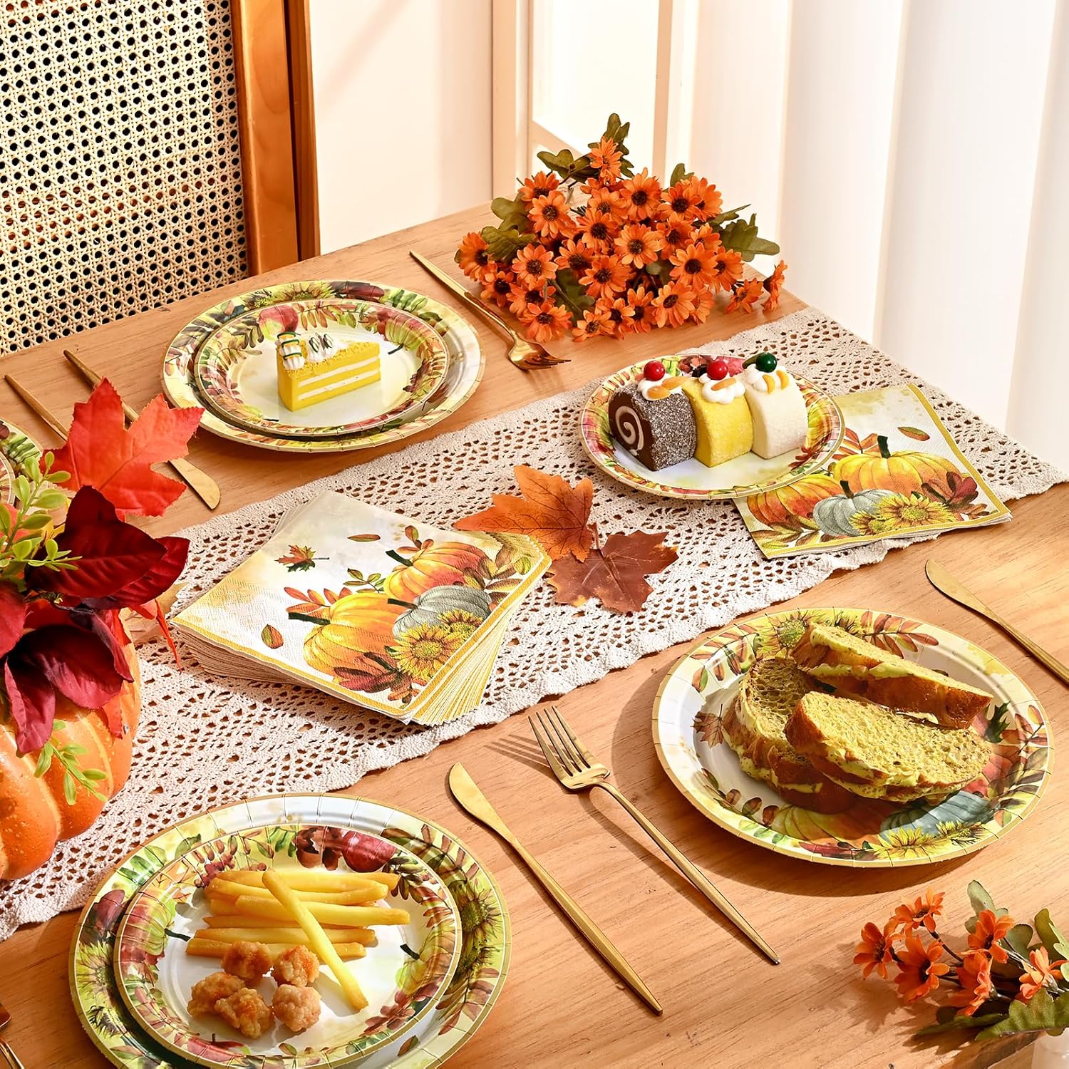 THANKSGIVING PAPER PLATES AND NAPKINS EXQUISITE DESIGN: The fall plates and napkins sets consists of scattered autumn leaves, pumpkins, and sunflowers. Thanksgiving dinner plates and napkins are beautifully designed and warm, creating a strong atmosphere of autumn and gratitude as a whole, bringing warmth and romance to the guests attending the party.