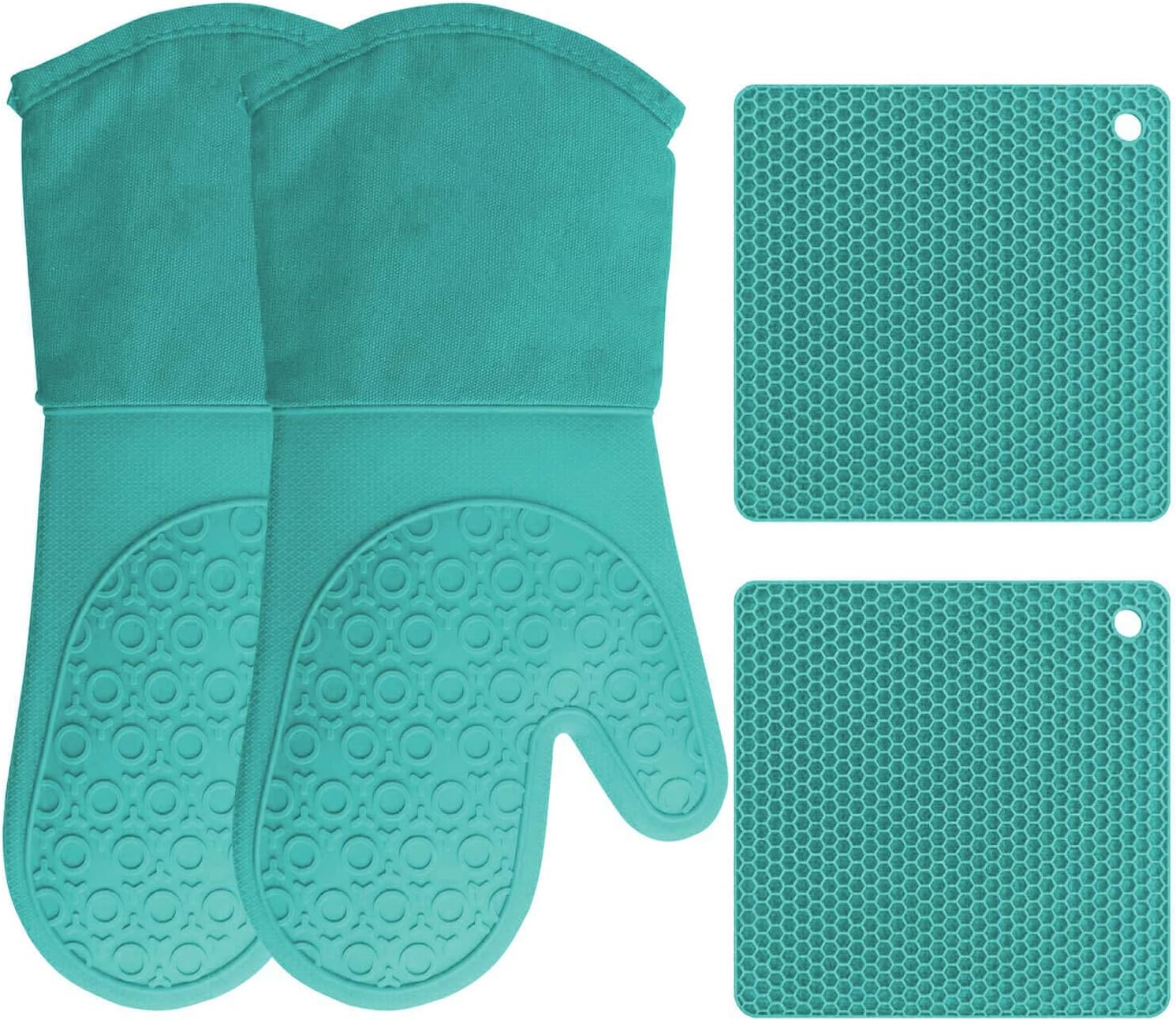 HOMWE Silicone Oven Mitts and Pot Holders, 4-Piece Set, Heavy Duty Cooking Gloves, Kitchen Counter Safe Trivet Mats, Advanced Heat Resistance, Non-Slip Textured Grip (Aqua Turquoise)