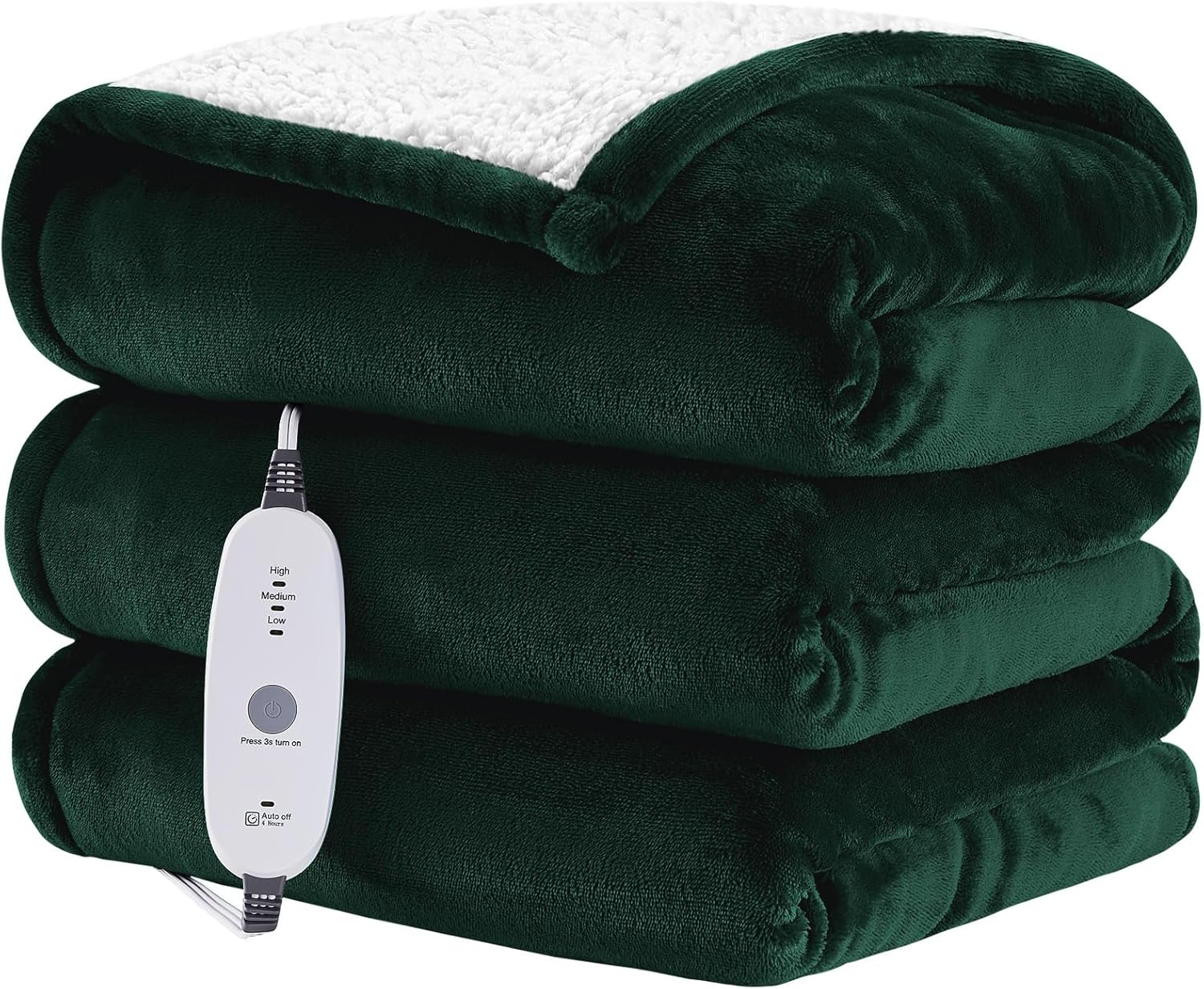HYLEORY Heated Throw Blanket Flannel Electric Blanket Throw with 4 hrs Timer Auto-Off & 3 Heating Levels Sherpa Heated Blankets with Overheating Protection,50"x60",Green