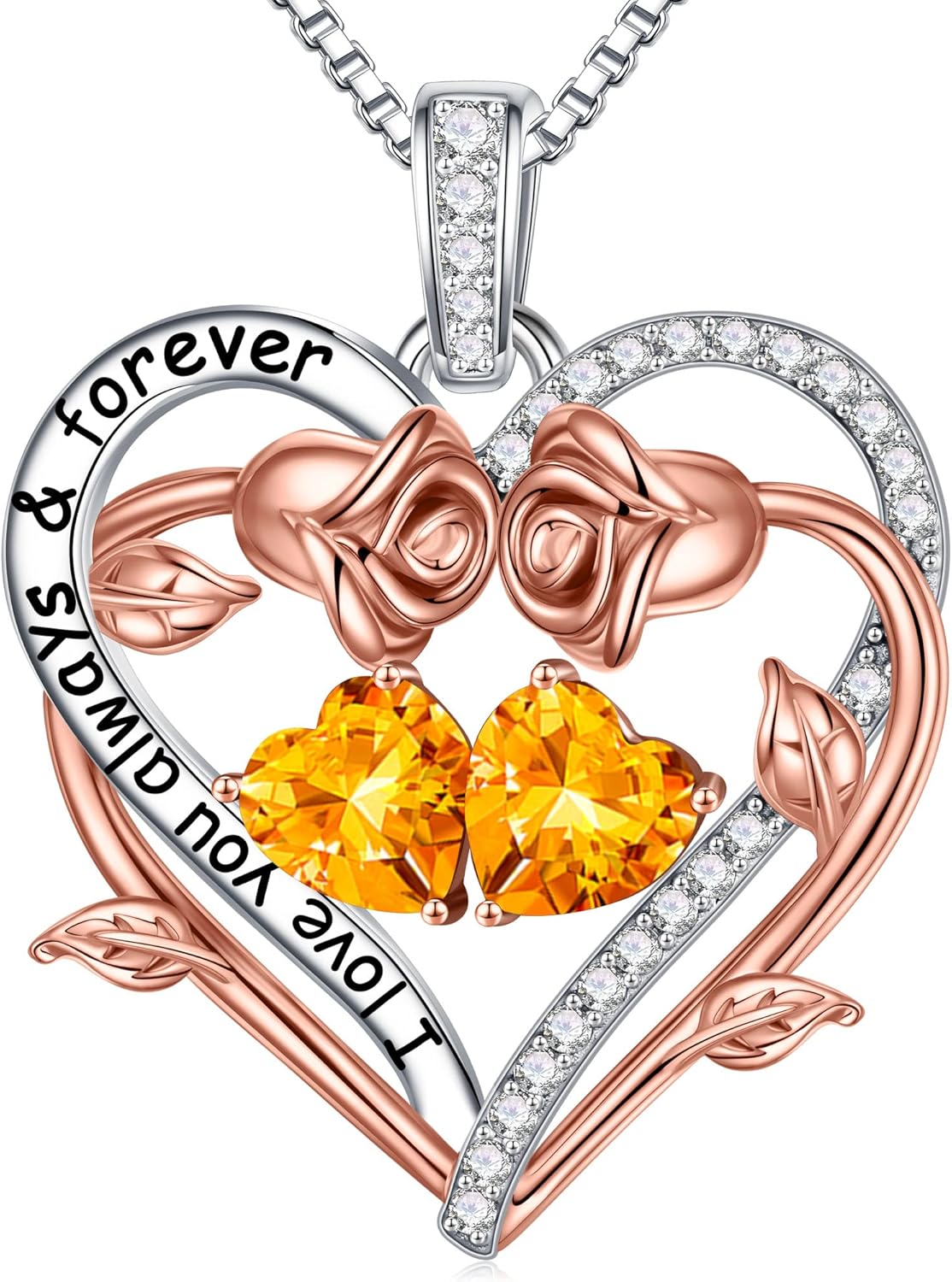 Iefil Rose Heart Double Birthstone Necklace Gifts for Wife Her Mom Women, Birthstone Jewelry Gemstone Birthday Gifts for Girlfriend Grandma Her Wife Women