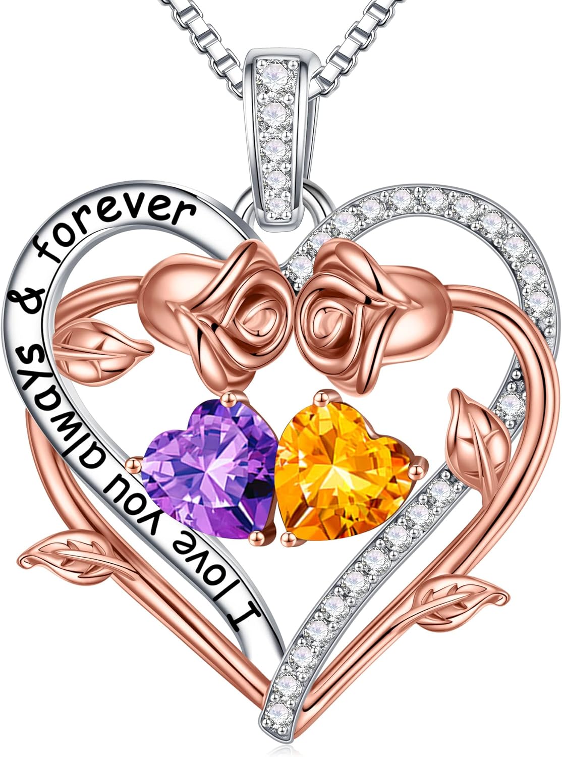 Iefil Rose Heart Double Birthstone Necklace Gifts for Wife Her Mom Women, Birthstone Jewelry Gemstone Birthday Gifts for Girlfriend Grandma Her Wife Women