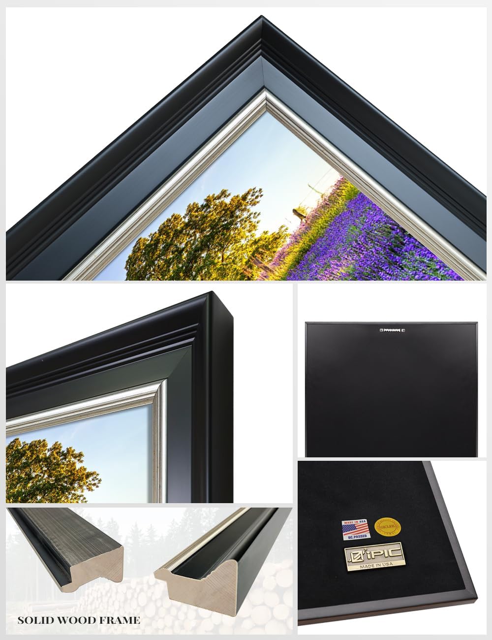 Lustrous Black Solid Wood Frame: This solid wood frame features a sleek black satin finish, smooth to the touch for a refined look. A speckled silver slip and beveled detailing add depth, beautifully showcasing your artwork. Picture size: 18" x 12", total framed size: 21.25" x 15.25", Pre-assembled and ready to hang.