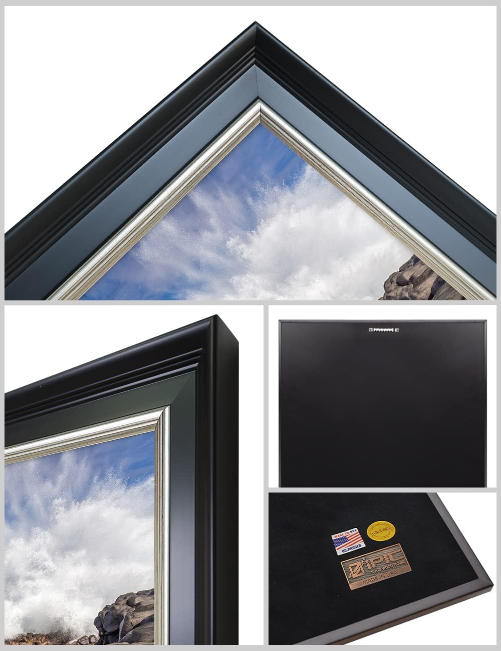This Solid Wood Frame is Lustrous Black and Has A Satin Finish that is Smooth to the Touch. A Speckled Silvery Slip and Beveled Detailing Give Just the Right Depth to Beautifully Display Your Art. Picture Size: W 18x H 12", Total Framed Size: W 21.25" x H 15.25". Ready for hanging.