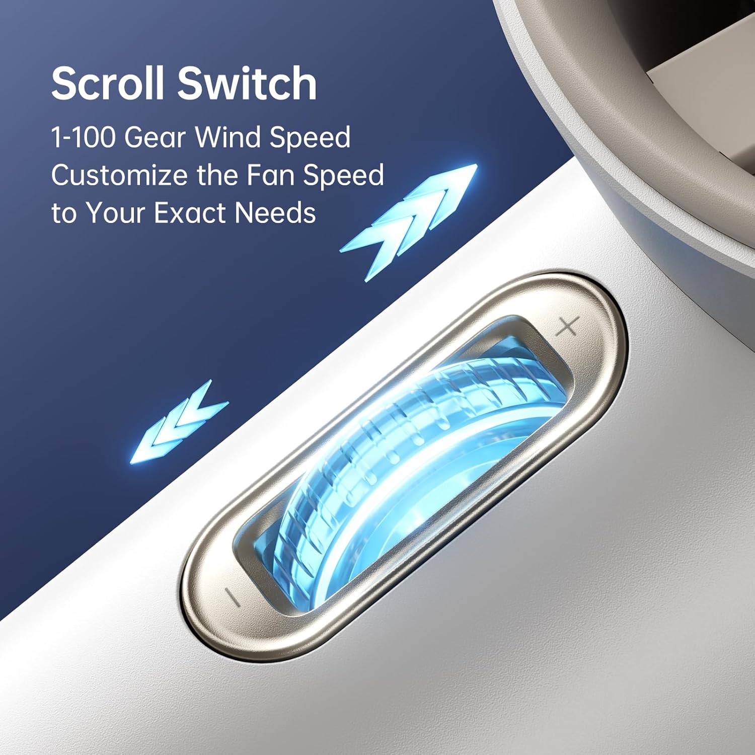 Scroll Switch - Customizable Wind Speed: This small fan adopts a scroll switch design, and the wind speed can be adjusted steplessly. The portable fan can customize speeds from 1 to 100, meeting your various wind power needs in any scene
