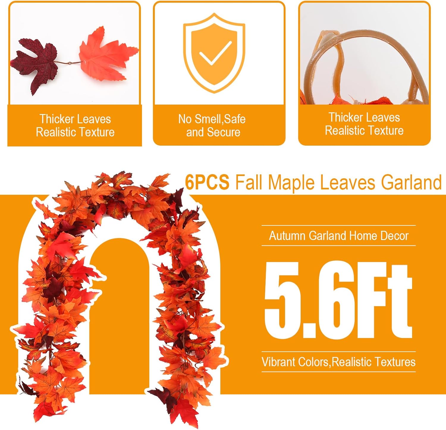 Joyhalo 6 Pack Fall Garland, Maple Leaves Garland Indoor Outdoor Fall Decor,Hanging Maple Leaves for Mantle,Door Frame,Fireplace and Thanksgiving Decor