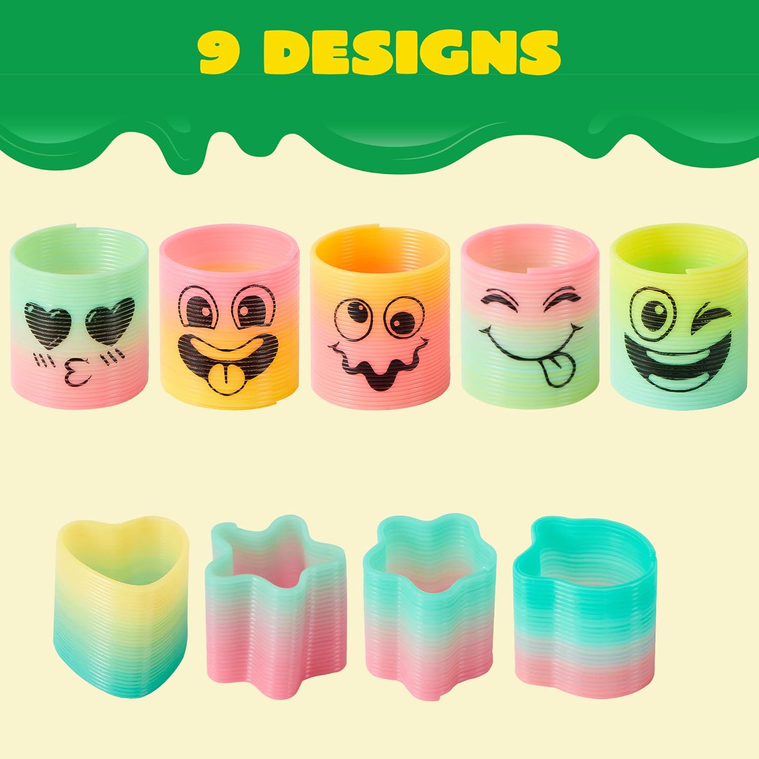 COMPREHENSIVE SET. Our rainbow springs party favors includes 20 mini round face springs, 10 mini shaped springs . You will surely make a lasting impression with your guests and friends with these birthday goodie bag stuffers.