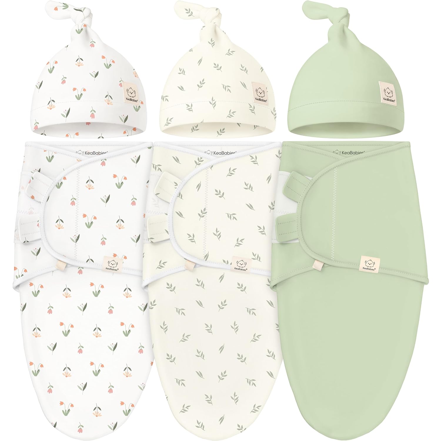 KeaBabies 3-Pack Swaddles for Newborns, Girls, Boys with Hats - Organic Soft Baby Sleep Sacks, Breathable Baby Swaddle 3-6 Months Beanies Set, Premie Infant Sleep Sack 0-3 Months (Fleur)