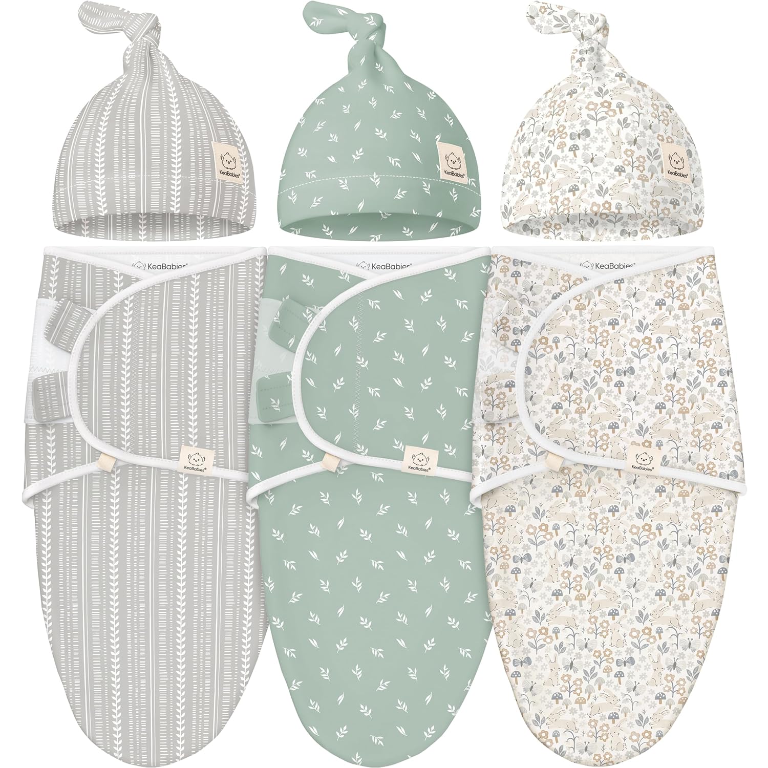 KeaBabies 3-Pack Swaddles for Newborns, Girls, Boys with Hats - Organic Soft Baby Sleep Sacks, Breathable Baby Swaddle 3-6 Months Beanies Set, Premie Infant Sleep Sack 0-3 Months (Prairie)