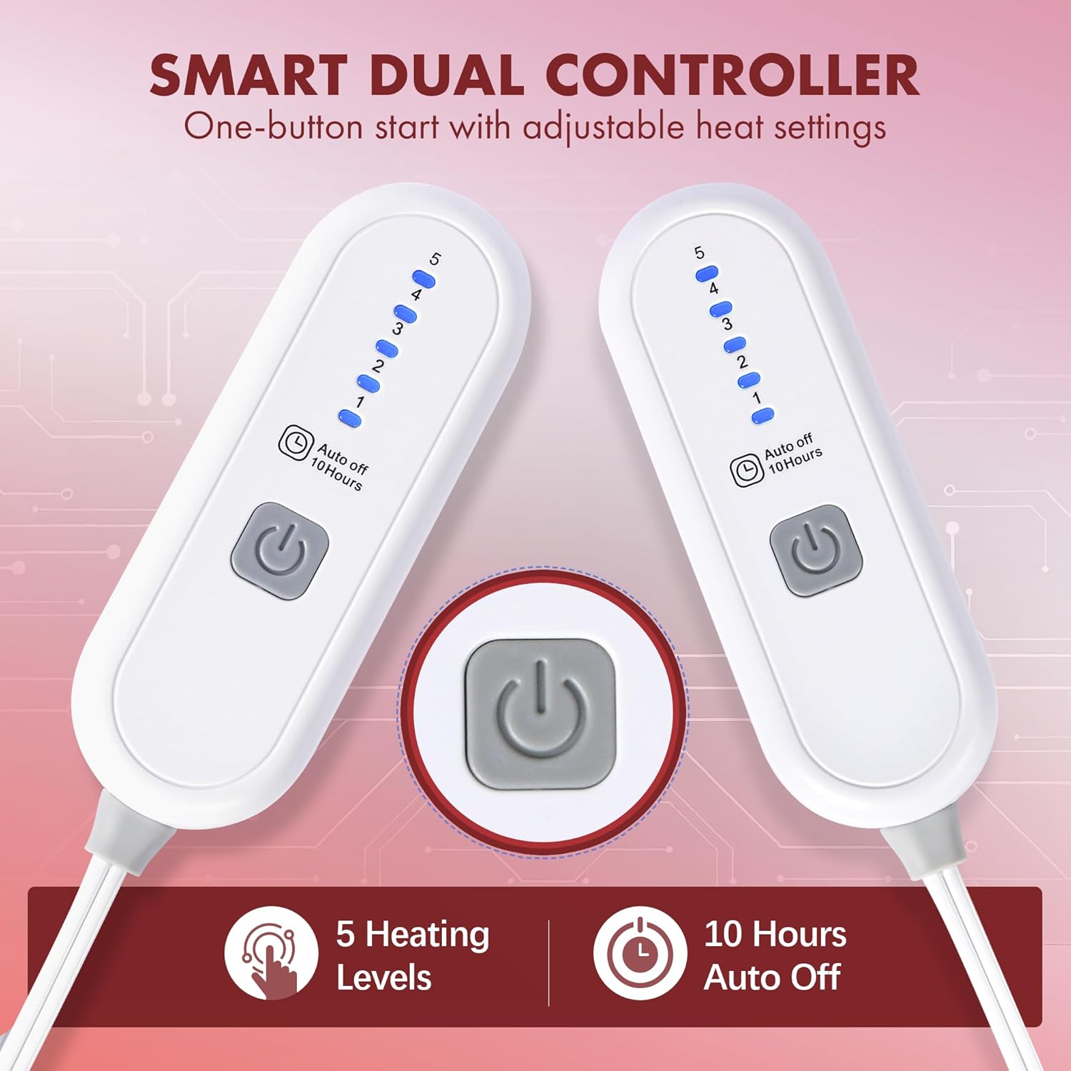 Dual-Zone Independent Temperature Control - Crafted with ultra-soft 100% polyester, this luxurious king size heated blanket features dual controllers with 5 heat settings and 10 hours auto off, warming up quickly and fitting king-sized mattresses perfectly