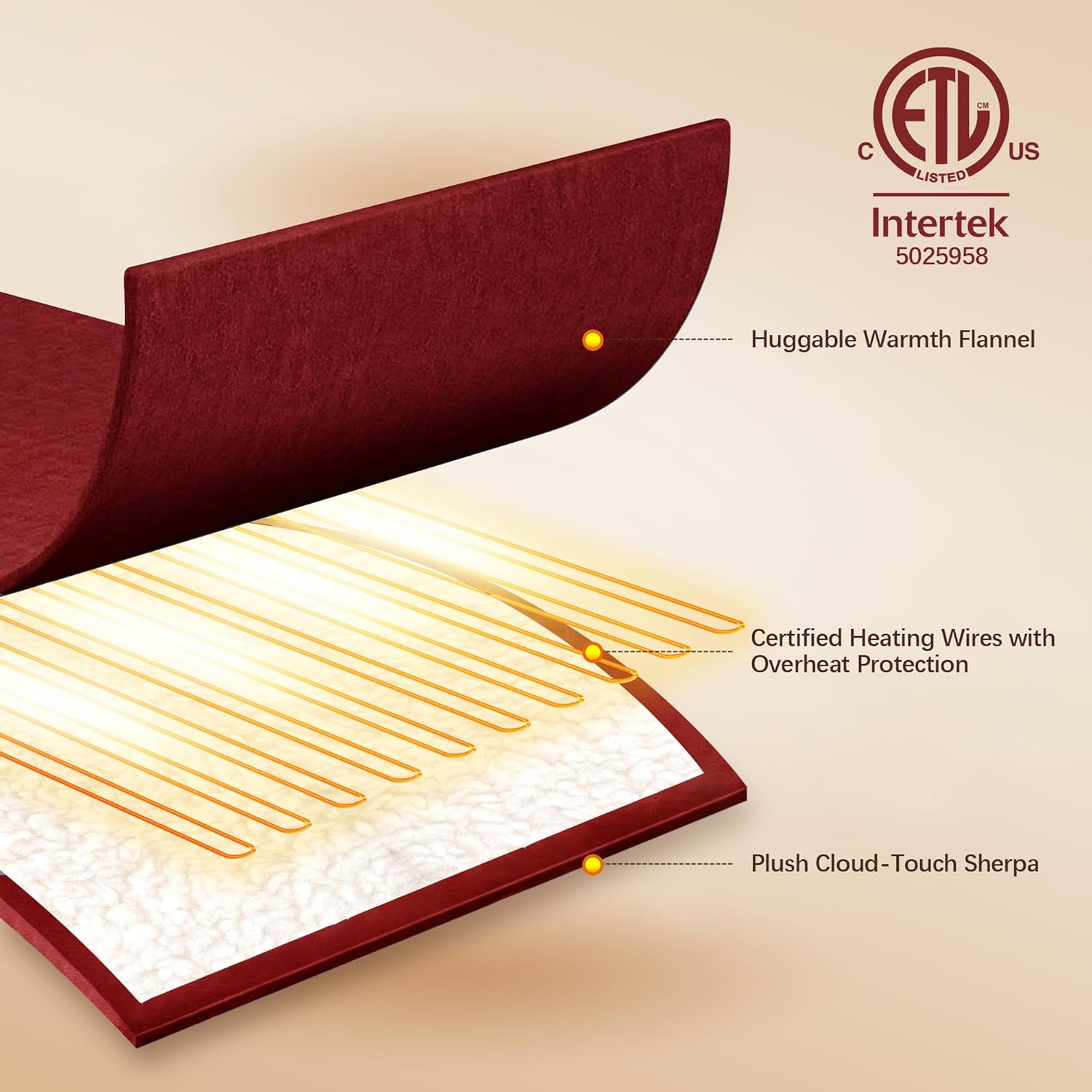 ETL & FCC Certified - The VELLUBAM electric blanket is rigorously tested and certified by ETL and FCC, ensuring enhanced safety and minimal electromagnetic radiation during use. Featuring advanced overheat protection, the heating blanket automatically stops heating or cuts power if temperatures rise too high, eliminating potential hazards