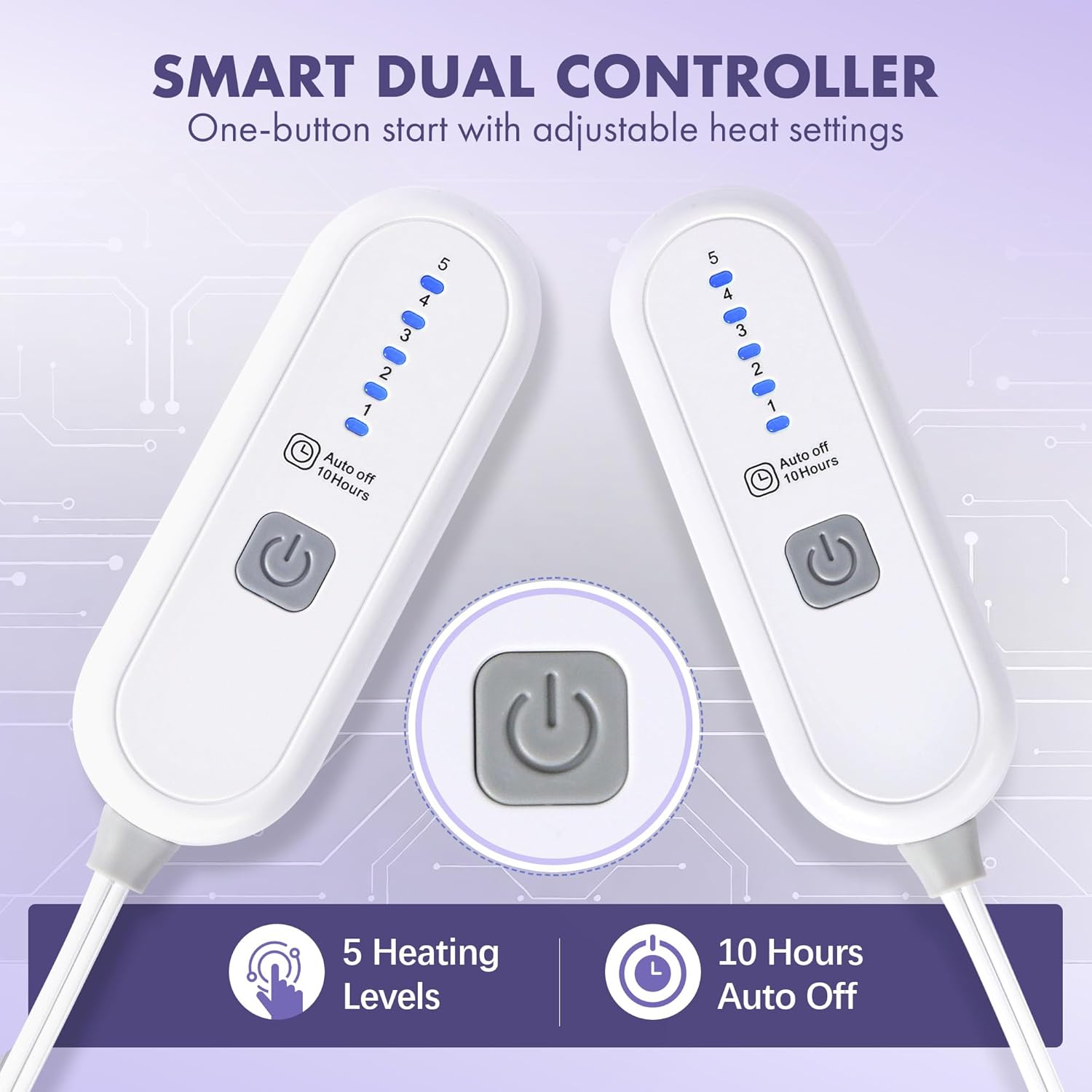 Dual-Zone Independent Temperature Control - Crafted with ultra-soft 100% polyester, this luxurious king size heated blanket features dual controllers with 5 heat settings and 10 hours auto off, warming up quickly and fitting king-sized mattresses perfectly
