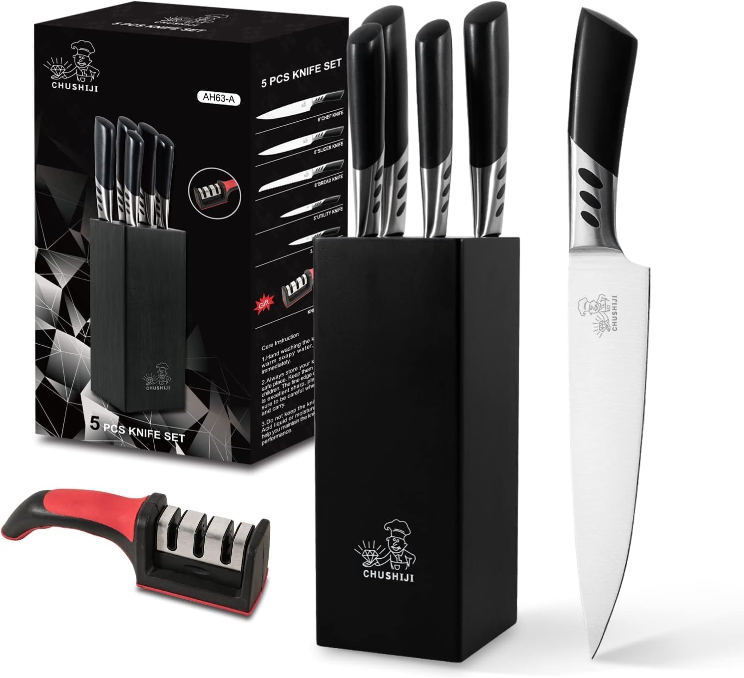 MODERN DESIGNED WOODEN KNIFE BLOCK:Made of natural rubber wood, CHUSHIJI's block with knife set features more solid block, specific position for each knife and a non-slip breathable bottom.the block features deep slots designed to safeguard the sharp blades, ensuring both protection and secure storage.