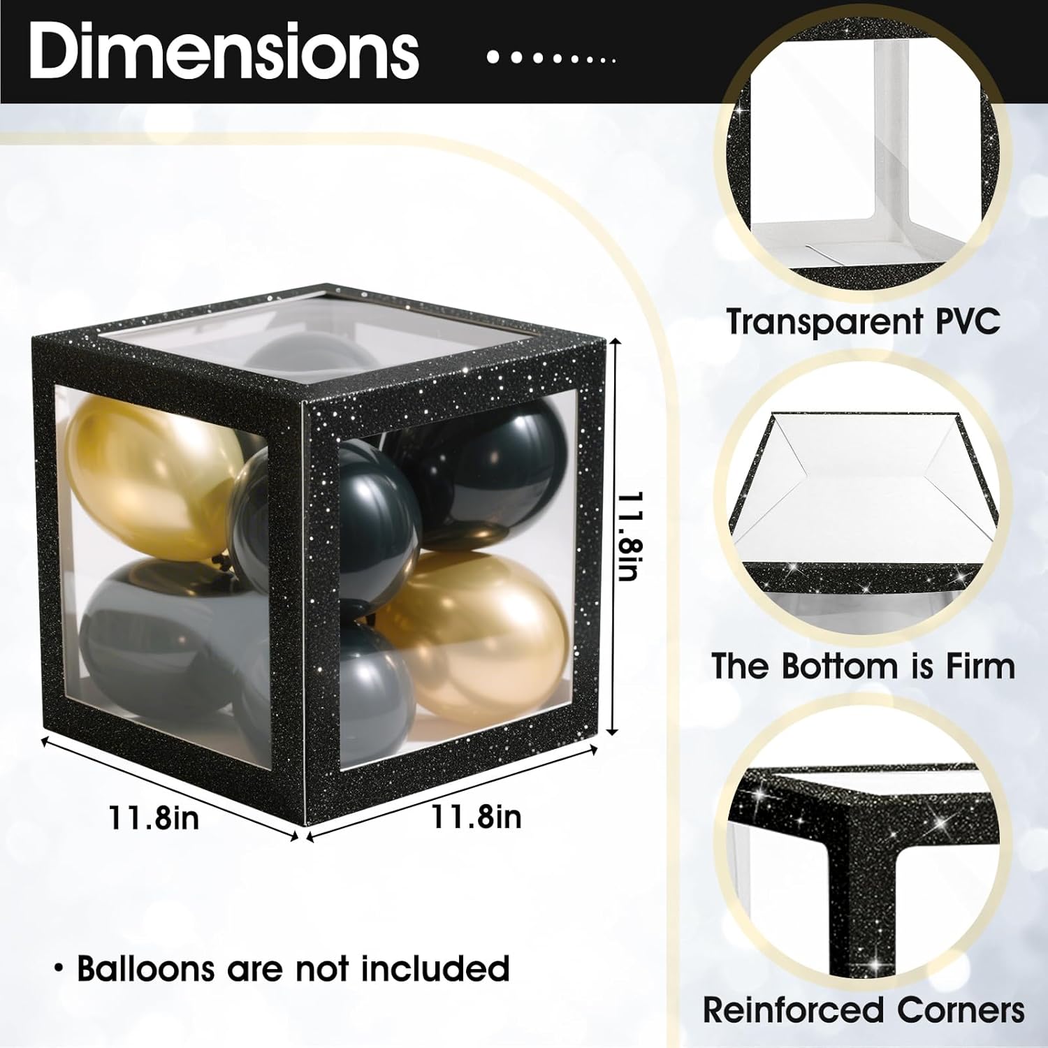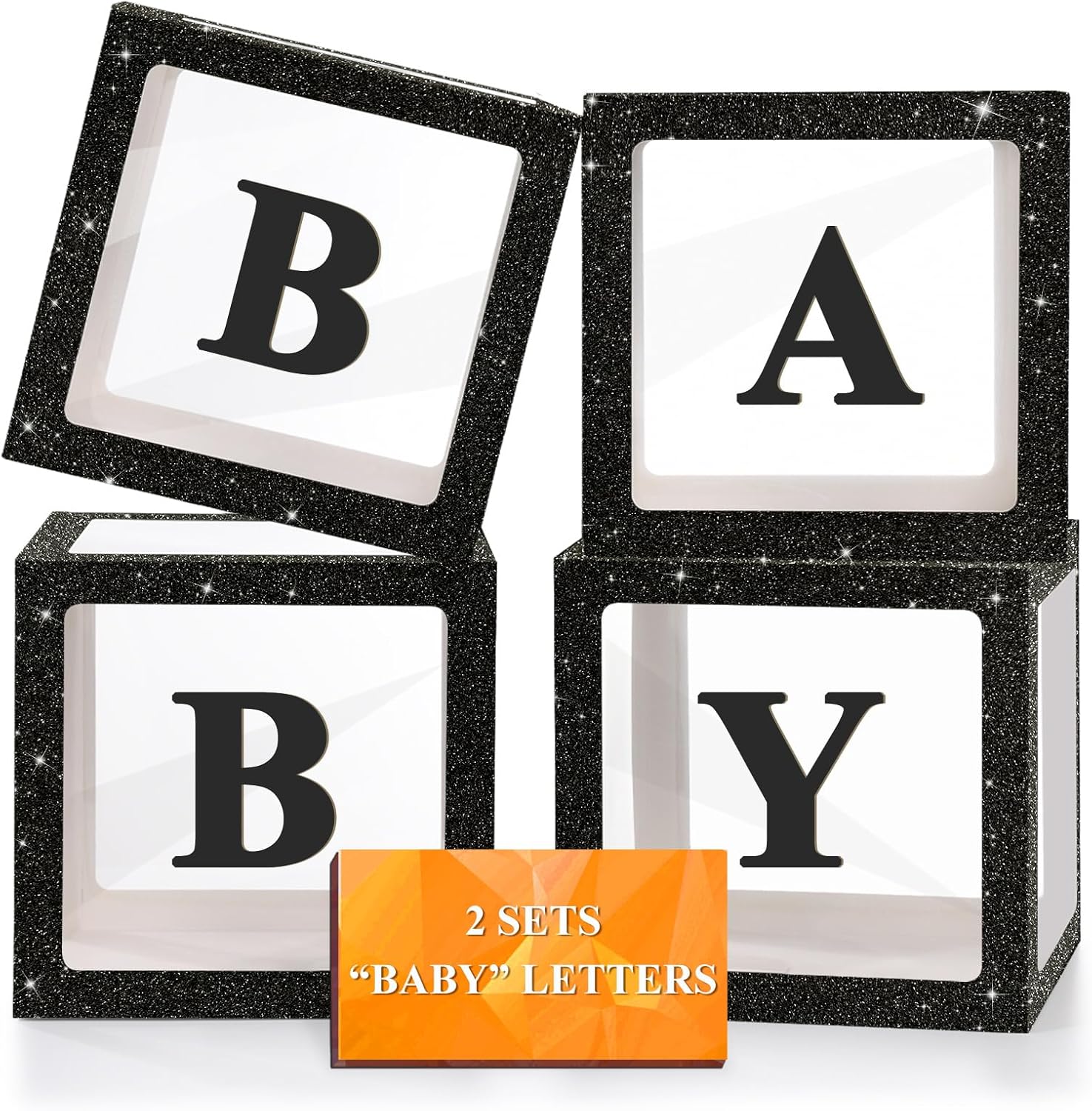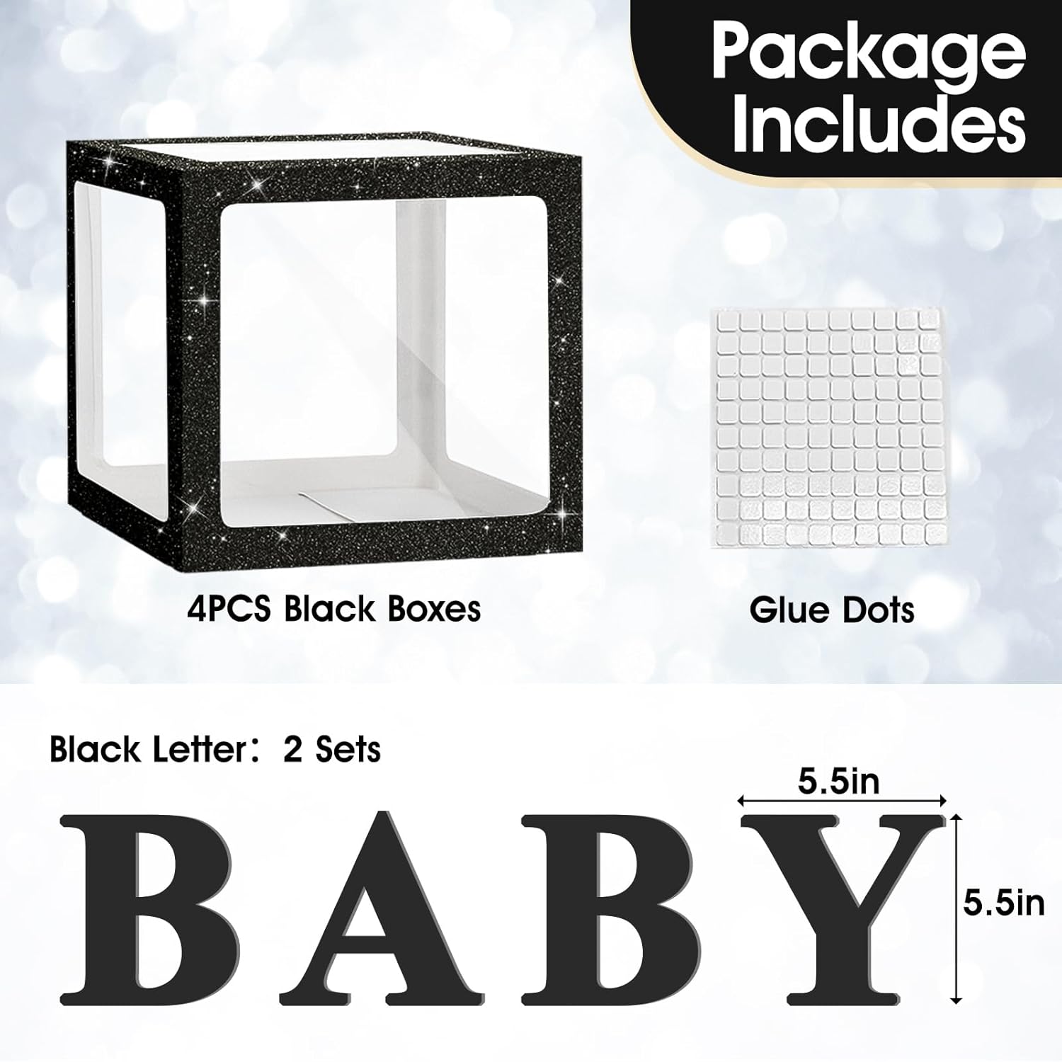 Package Included : You will receive 4 black glitter balloon boxes(11.8”×11.8”×11.8”), 2 “ BABY ”letter sets and adhesive dots. Stylish and practical, these items are perfect for a variety of occasions like baby shower, gender reveal, birthday party and more. The baby box will add a charming touch to your celebration while creating the perfect decorative backdrop for capturing memorable photos.