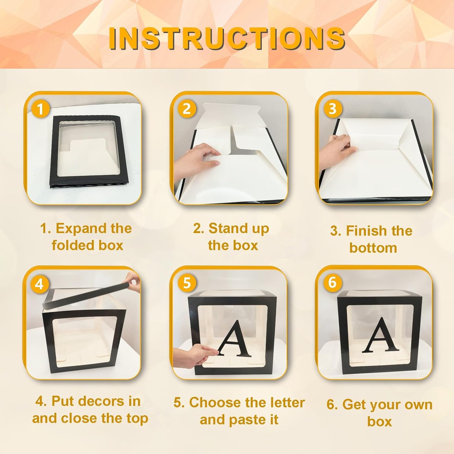 【Specification of Baby Boxes】A set of Party boxes includes 5 PCS 11.8(L)x11.8(W)x11.8(H) white transparent balloon boxes+ 78 PCS Letters + 1 pcs adhesives dots + 5 pcs LED lights.(This package does not include balloons)