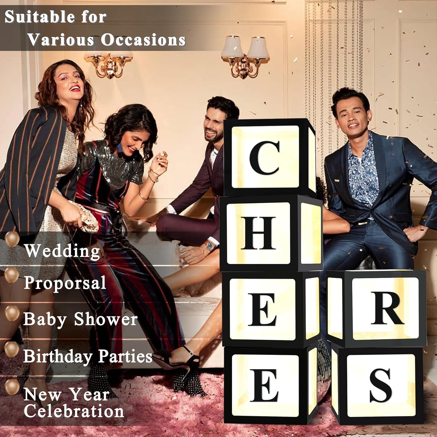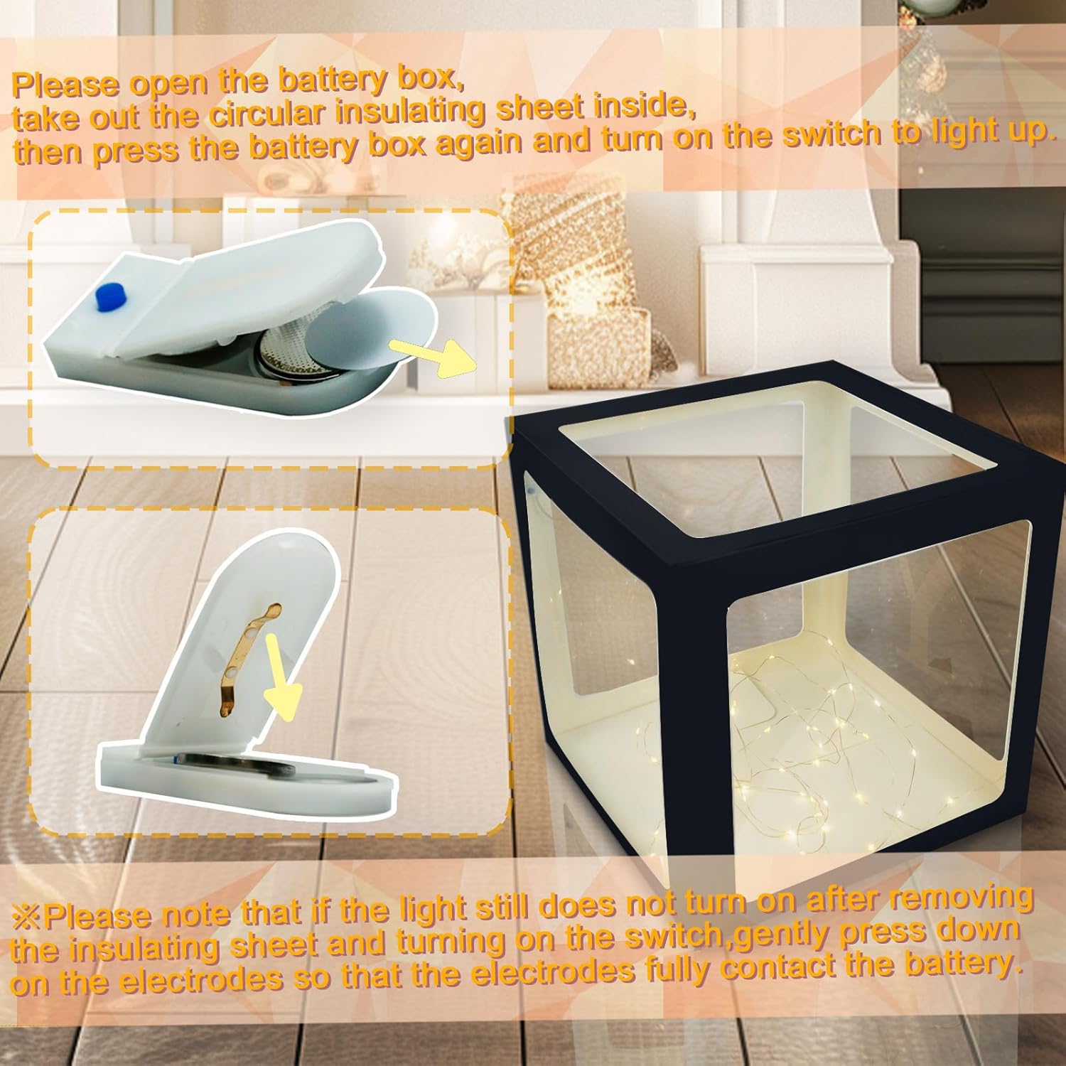 Ledido Transparent Balloon Boxes, Clear Balloon Boxes with 6 Pcs String Lights and 78 Letters for Baby Shower Gender Reveal Grad Birthday Party Anniversary Bridal Wedding Decor - 6 Black Boxes
