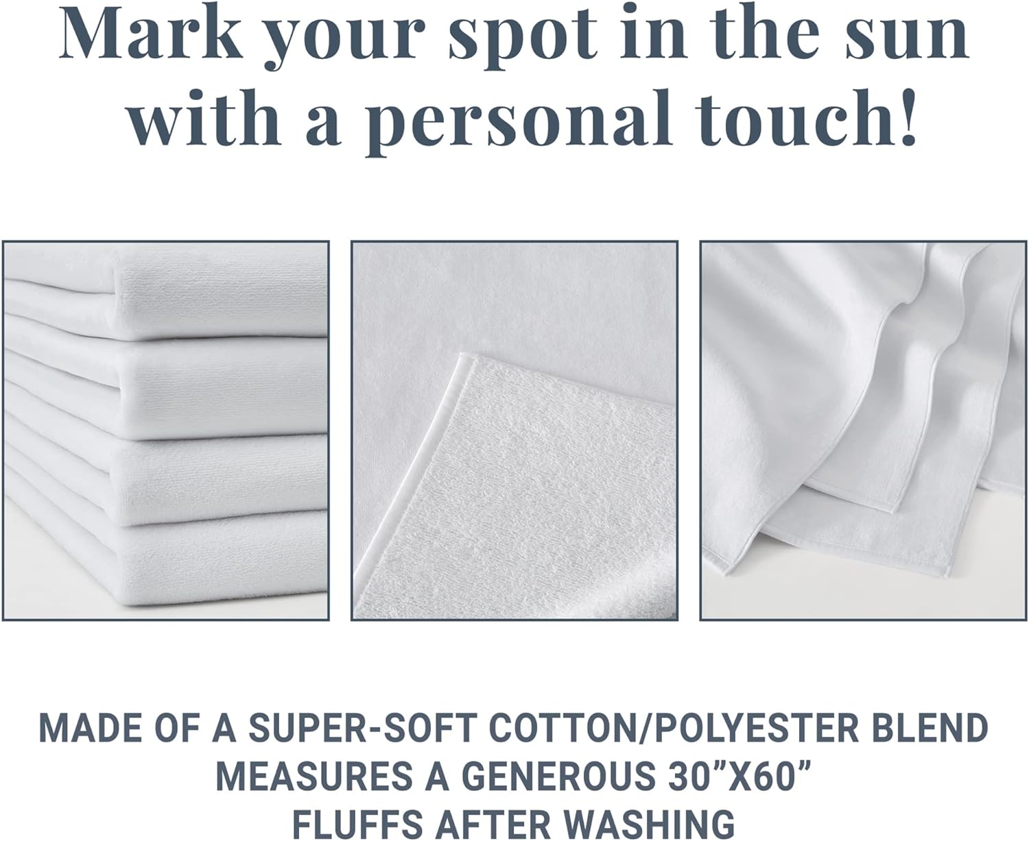 PREMIUM QUALITY: These towels take fun in the sun to another level. Available in 2 sizes—30"Wx60"L (standard) and 35"Wx70"L (oversized)—they're made from a soft cotton/poly blend and are machine washable. Imported for final manufacture locally.